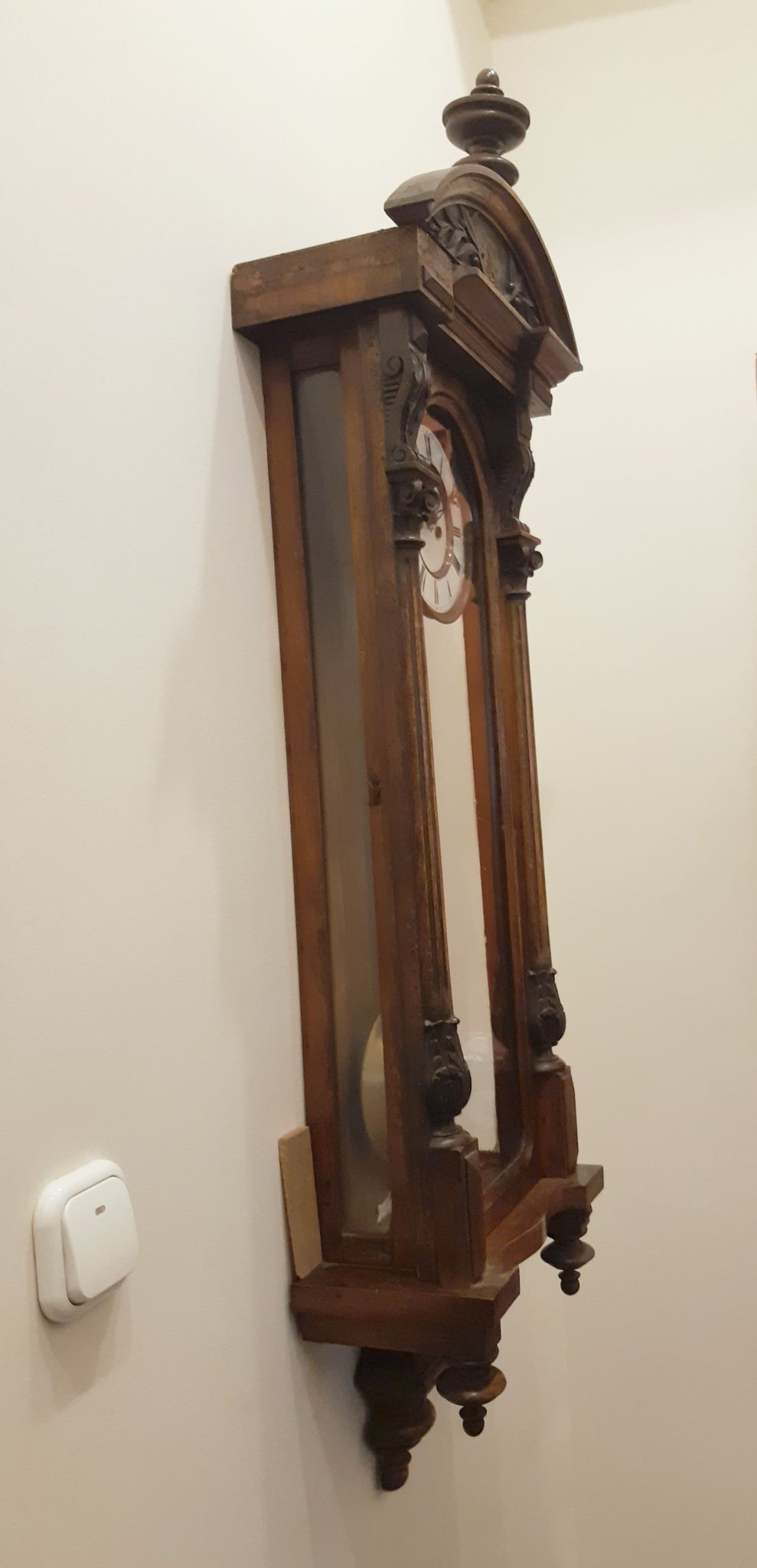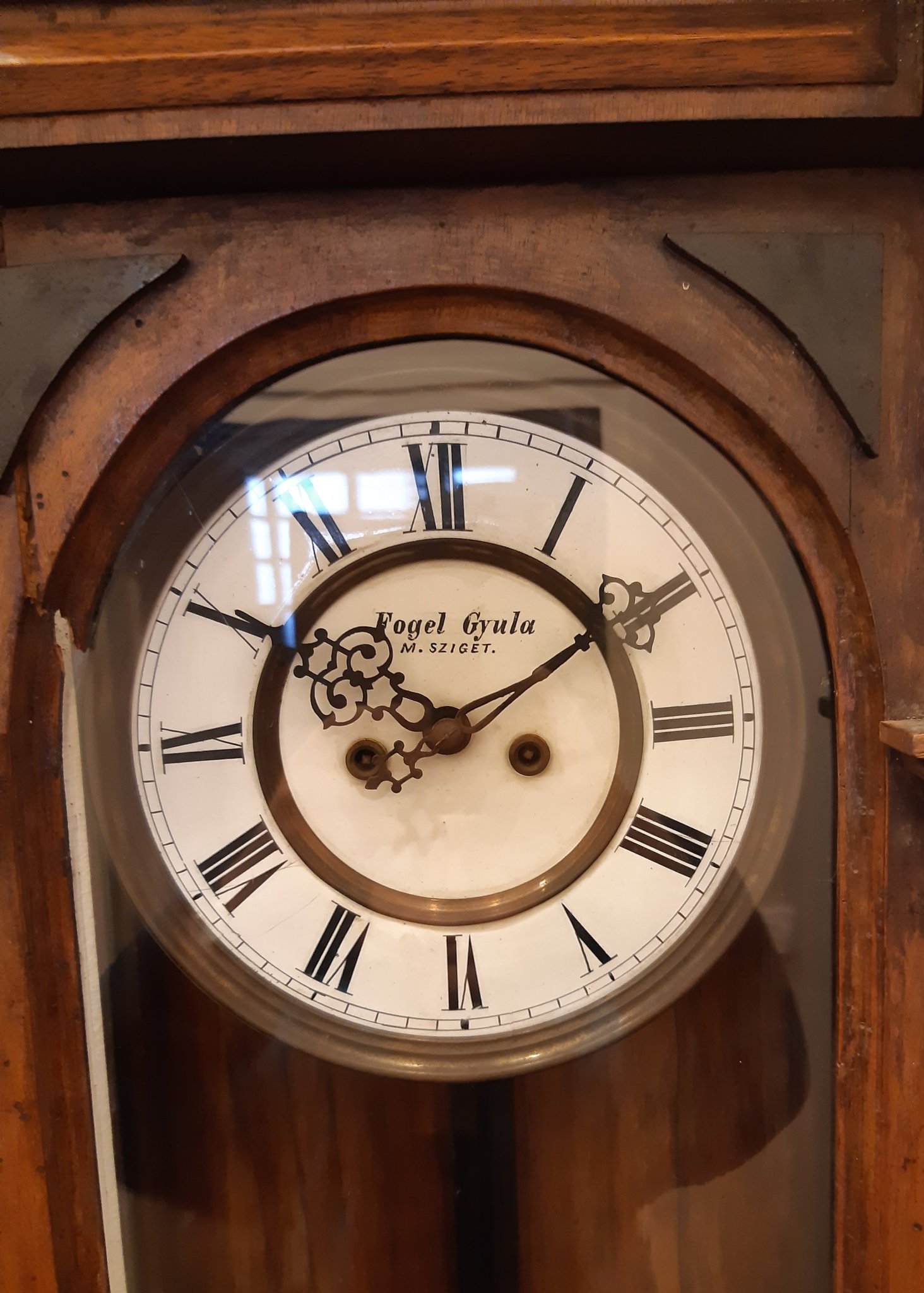 Antik ingás falióra. Jelenleg nem jár, de javítható, valamint két fa rátét hiányzik (lásd fotók). Fogel Gyula, 20.sz. eleje. Magassága: 125 cm Szélessége: 39 cm