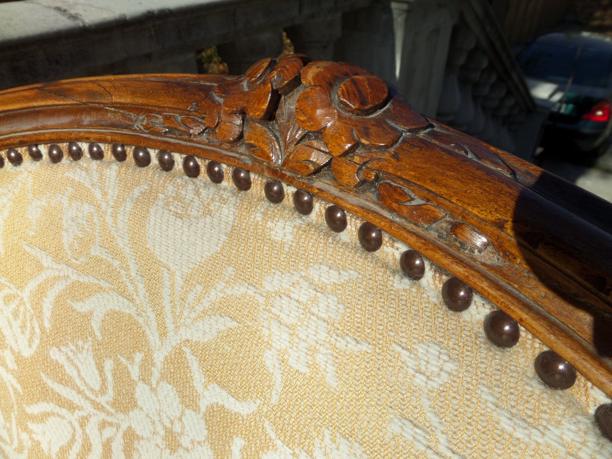 Bécsi neobarokk fotel, restaurált kárpitozással, faragott lábakkal és fejrésszel, jó állapotban. Méretei: ülőmagasság 50 cm. Támla magassága 94 cm, karfaszélesség 60 cm.