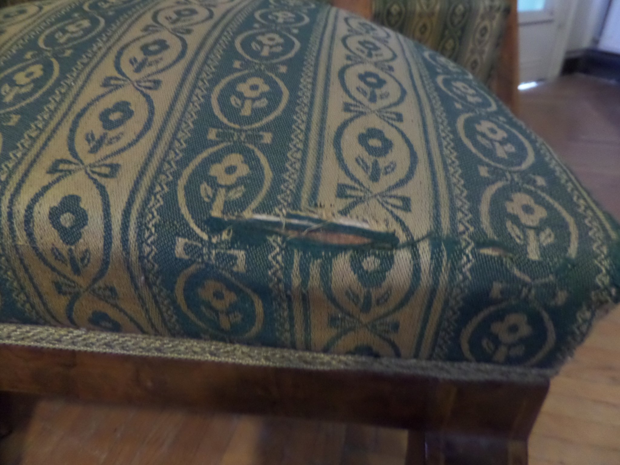 Biedermeier ülőgarnitúra, zöld-fehér népies virágos kárpitos, 6 db-os: 1 kanapé, 2 szék, 2 fotel, 1 asztal, Felújításra szorul. Méretei: kanapé: hossza 175 cm, magassága 105 cm, mélysége 75 cm asztal: lap 95x62 cm, magassága 76 cm, fotel: szélessége 78 cm, mélysége 67 cm, magassága 105 cm