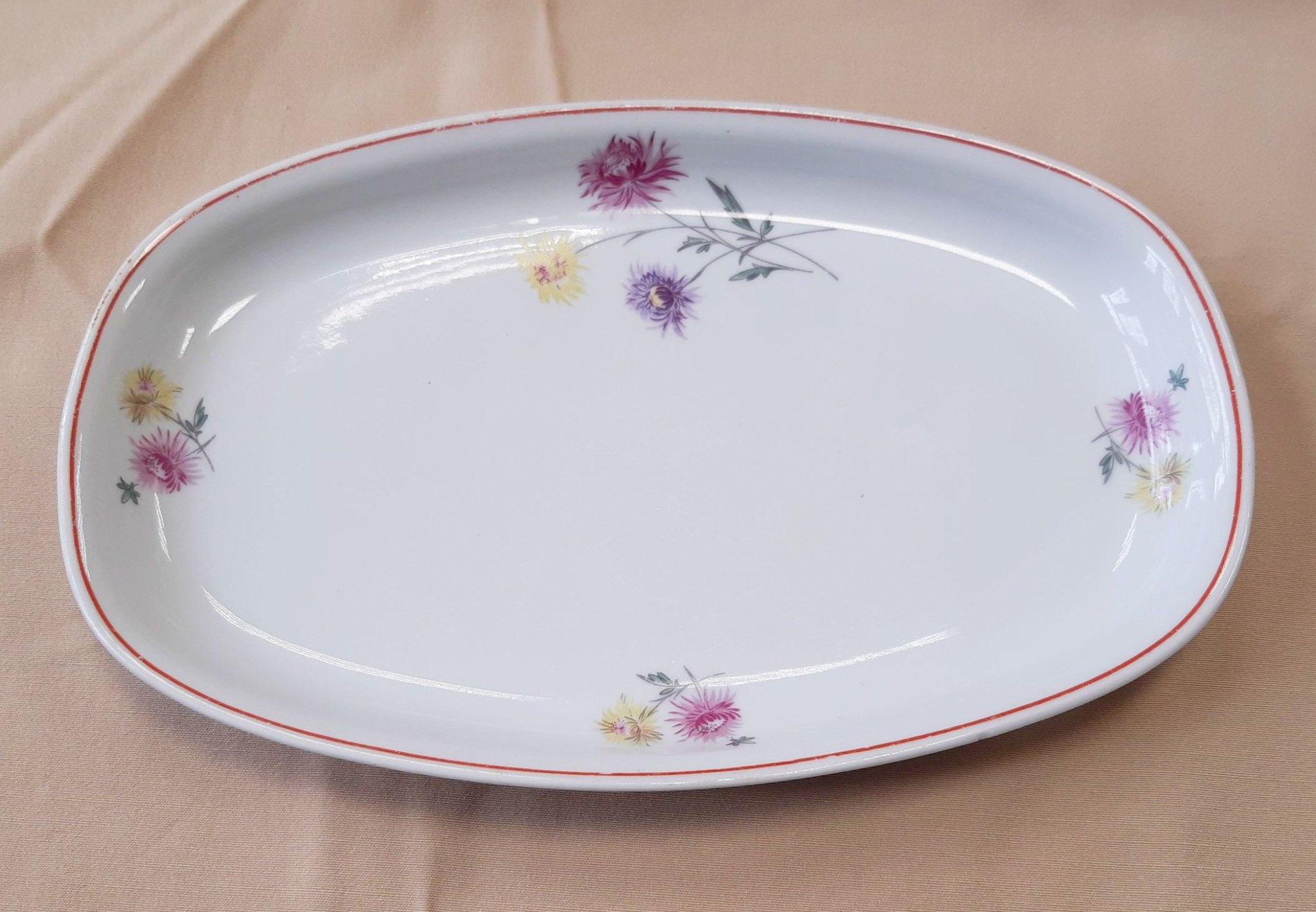 Freiberger német porcelán süteményes készlet, 1 hosszúkás tál (25x16cm), 7 sütistányér (átmérő:19 cm), krizantémos mintával, enyhén kopott, de ép állapotban.