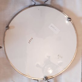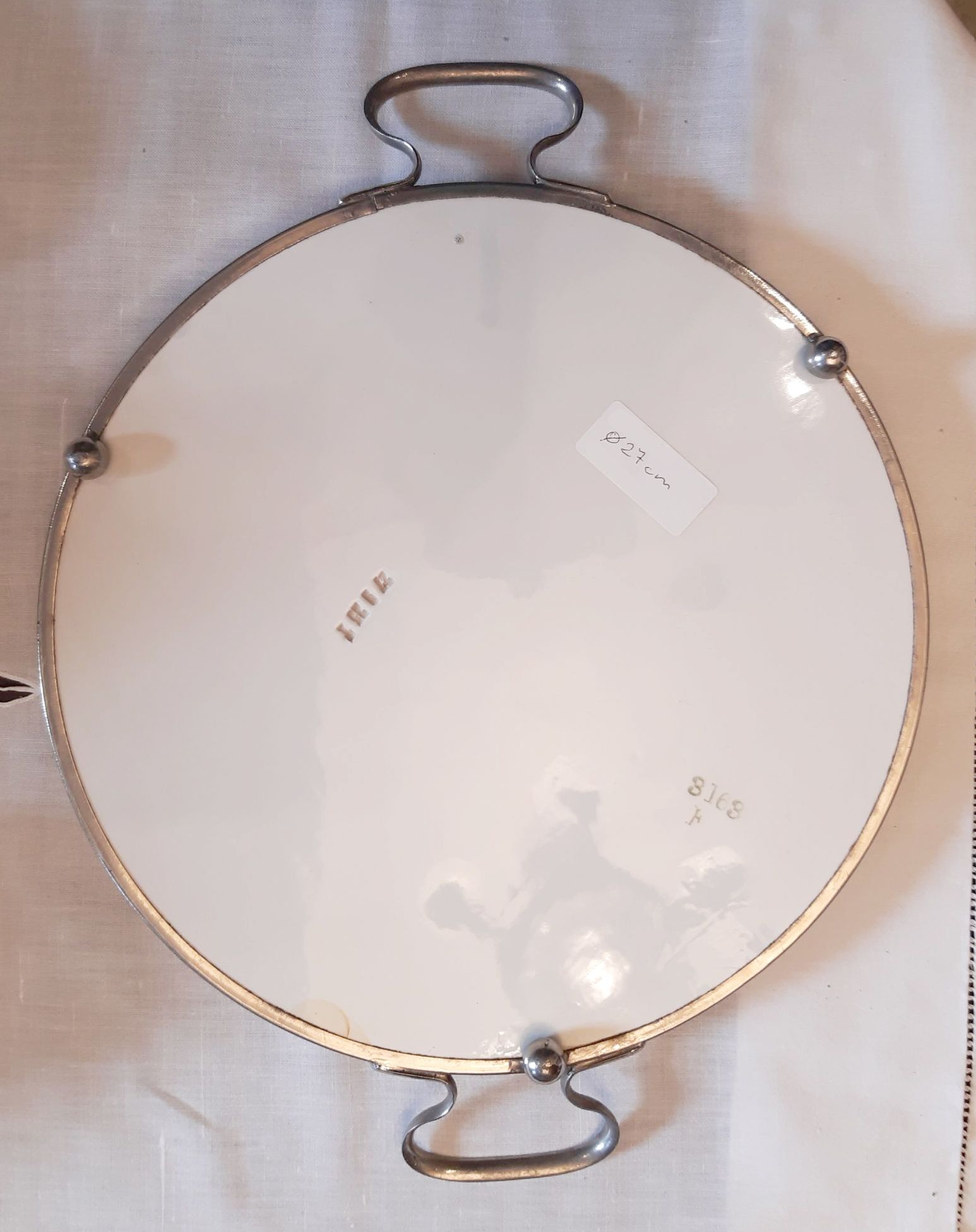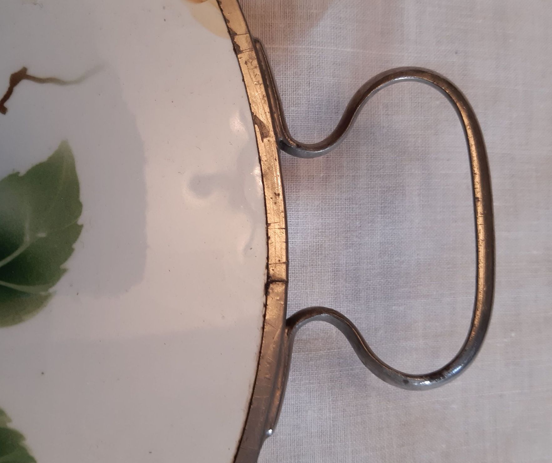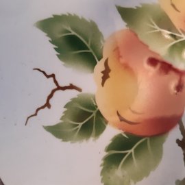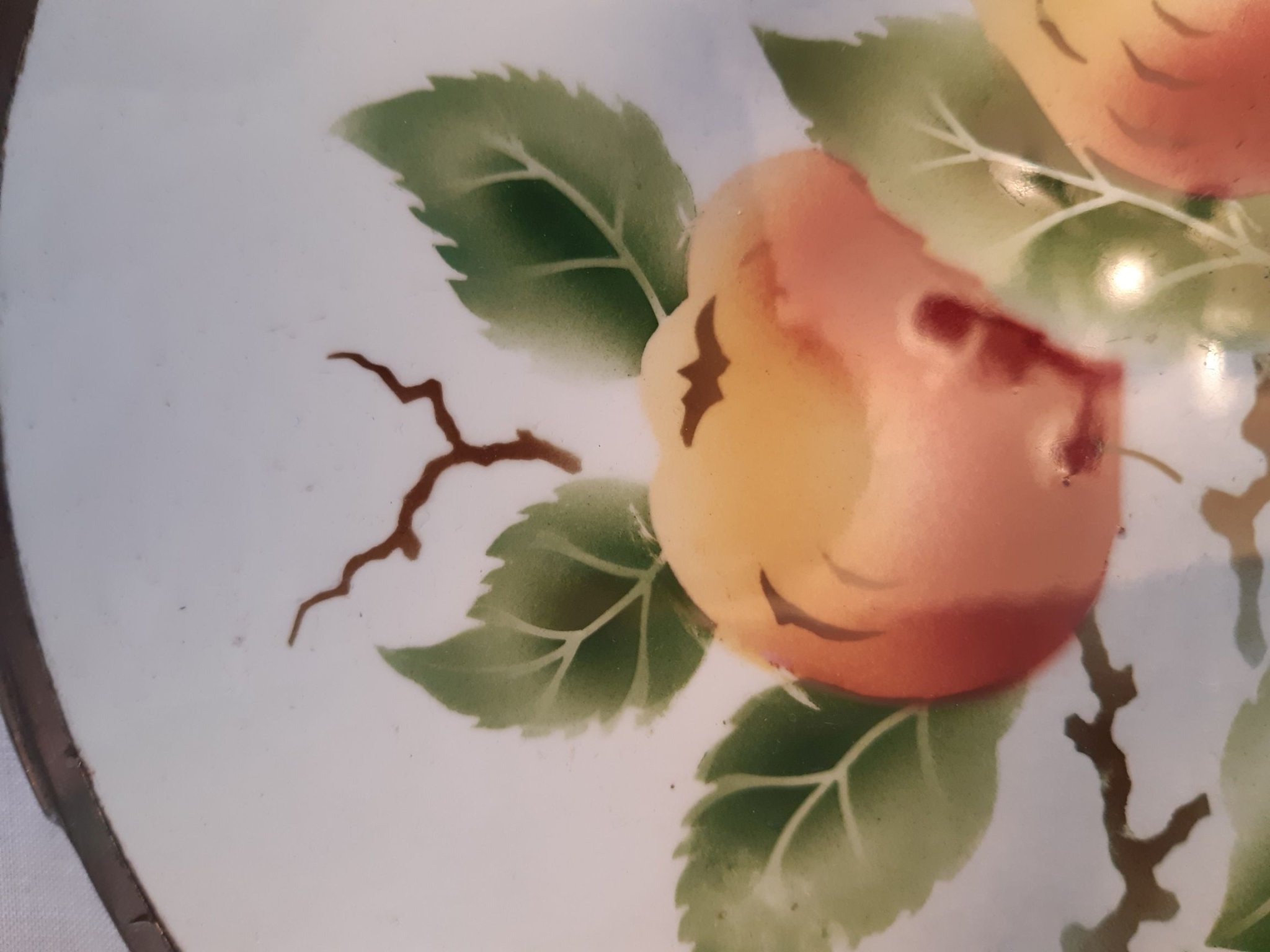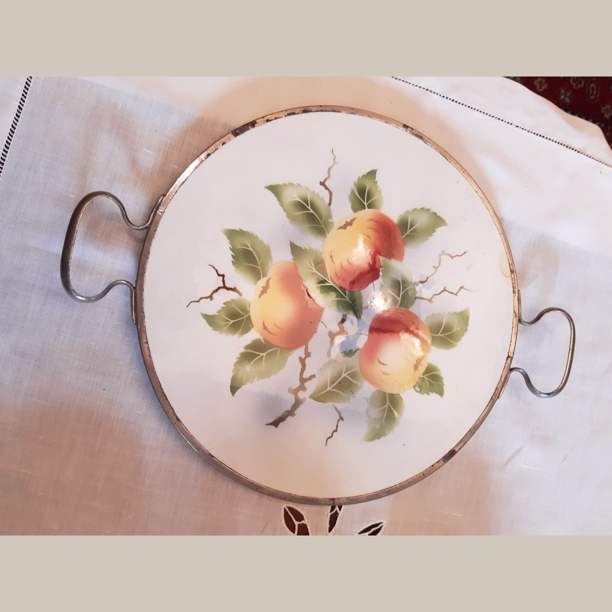 Füles kerámia kínálótálca almás vagy barackos mintával, golyólábakon. Használt, de hibátlan állapotban. Átmérője 28 cm, fülekkel együtt 36 cm.