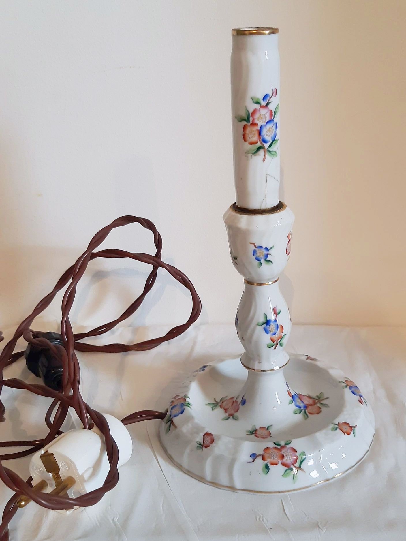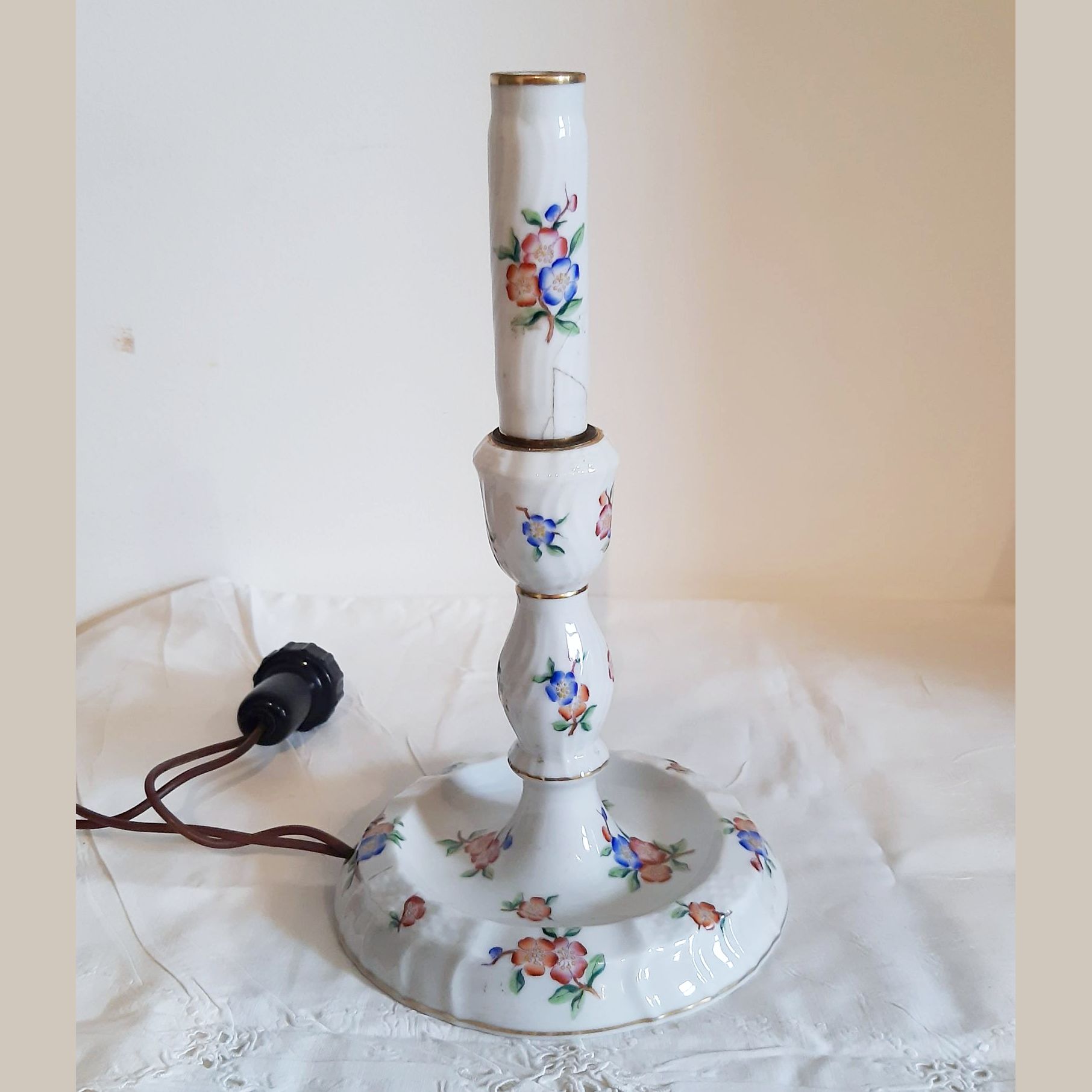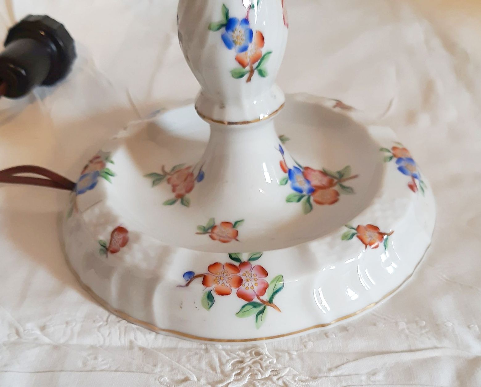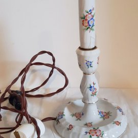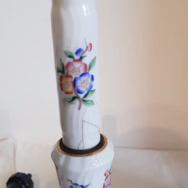Herendi porcelán asztali lámpa, virágos mintával, eredeti ernyővel, javított nyakkal (lásd fotó), működőképes. lámpatest magassága: 23,5 cm, ernyő magában 14 cm magas, átmérője 13 cm
