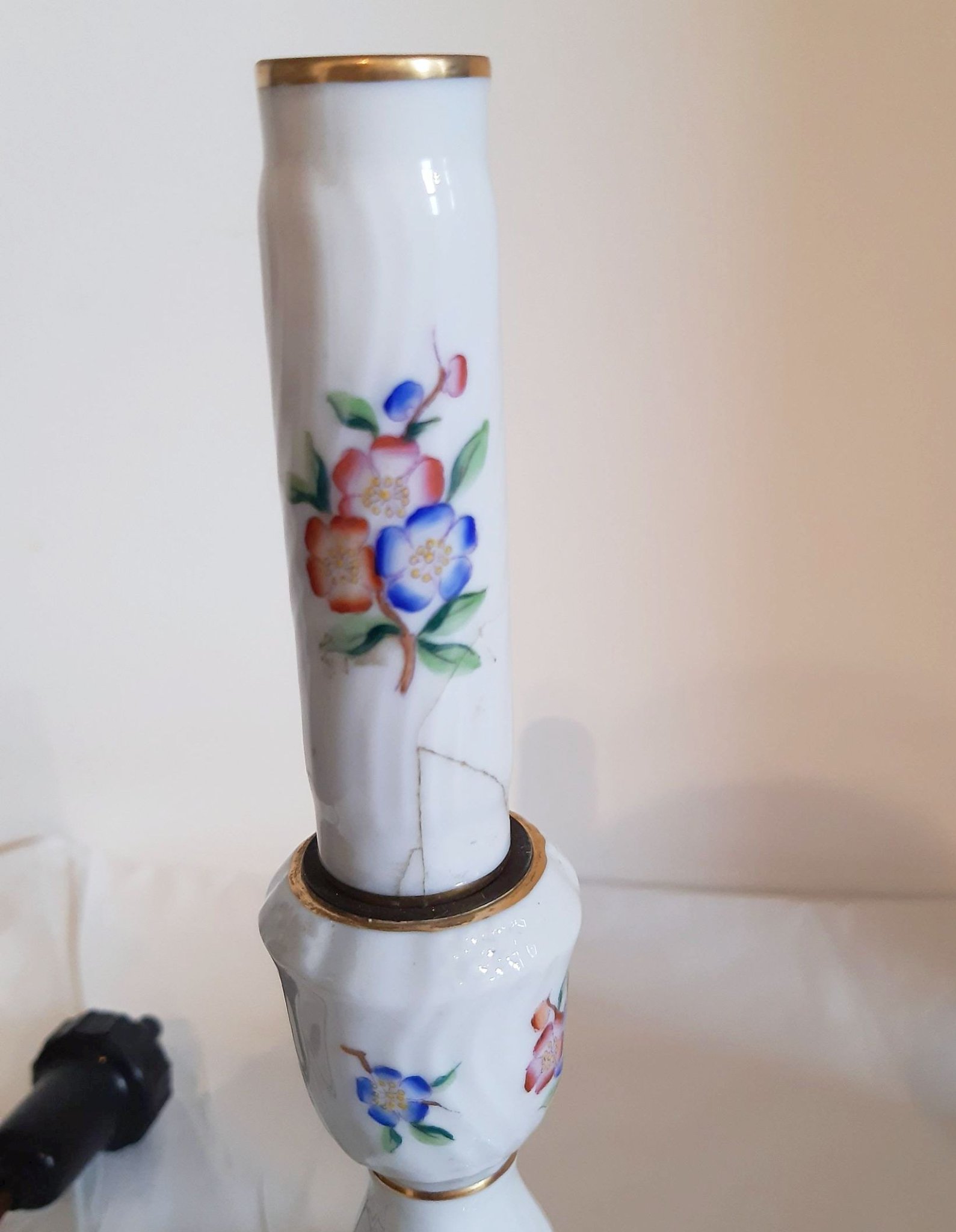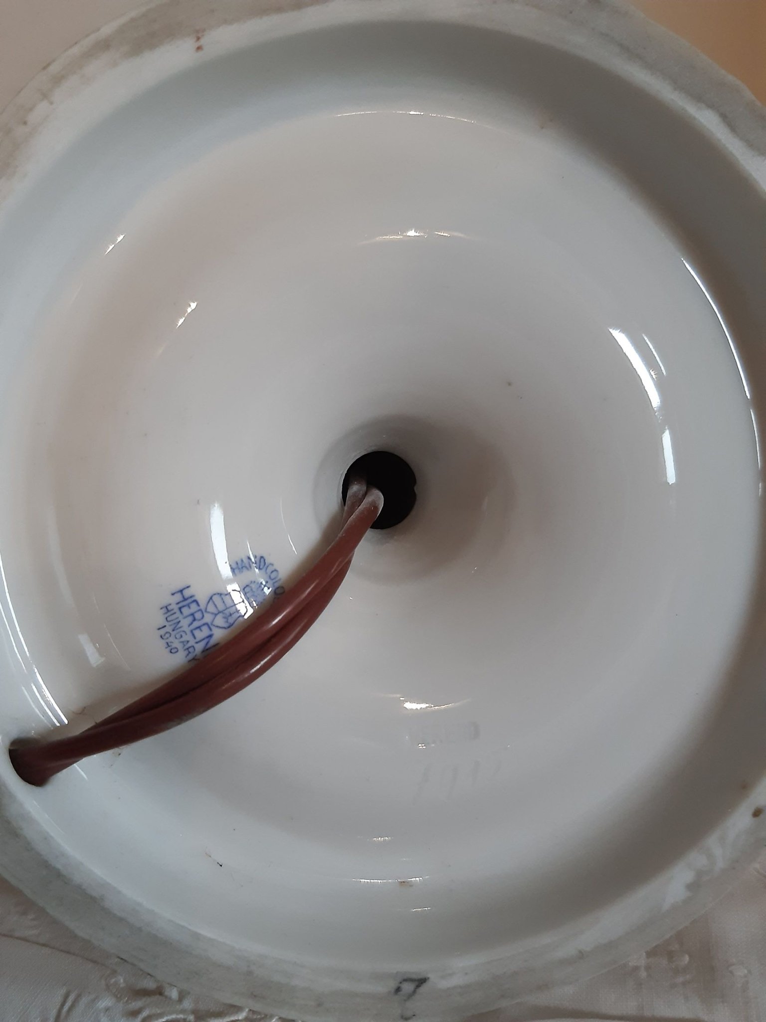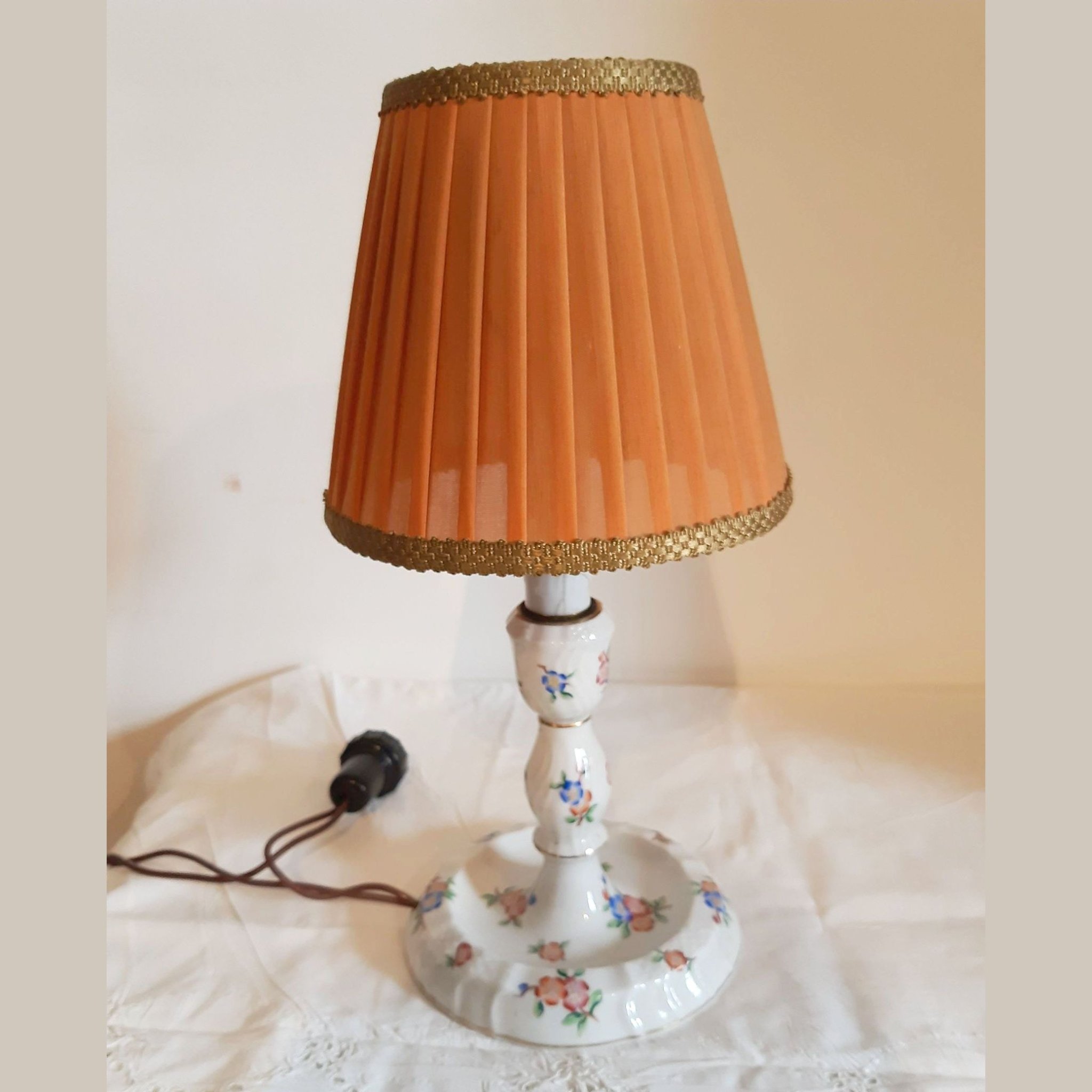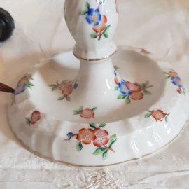 Herendi porcelán asztali lámpa, virágos mintával, eredeti ernyővel, javított nyakkal (lásd fotó), működőképes. lámpatest magassága: 23,5 cm, ernyő magában 14 cm magas, átmérője 13 cm