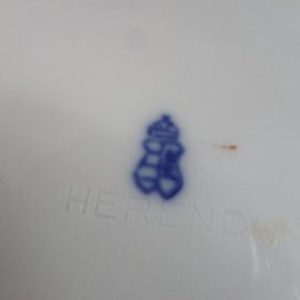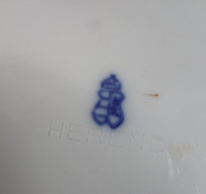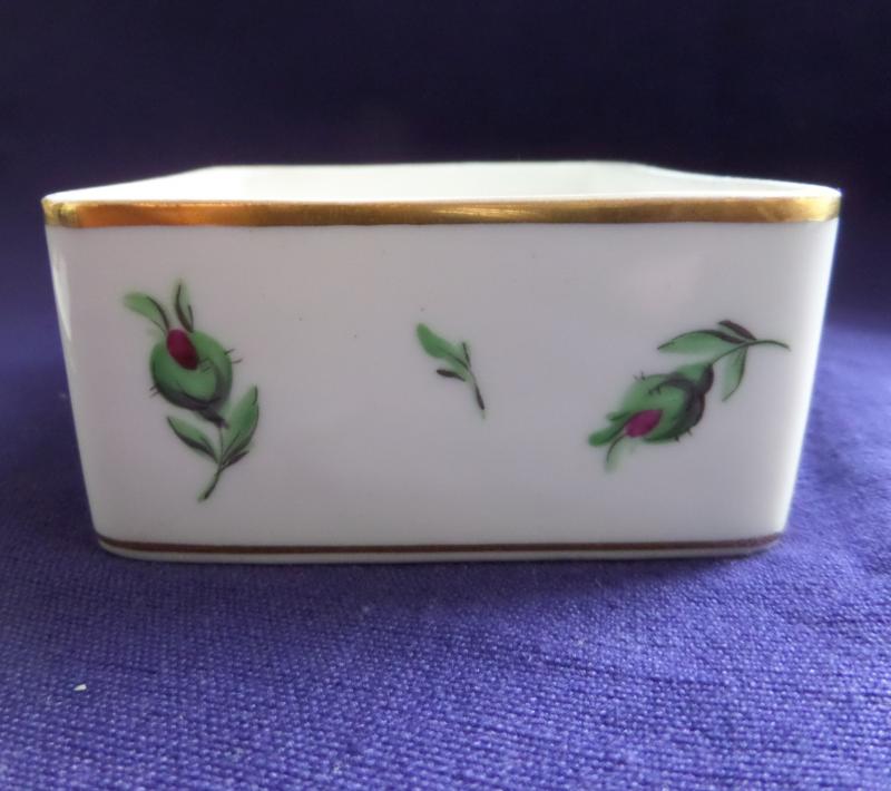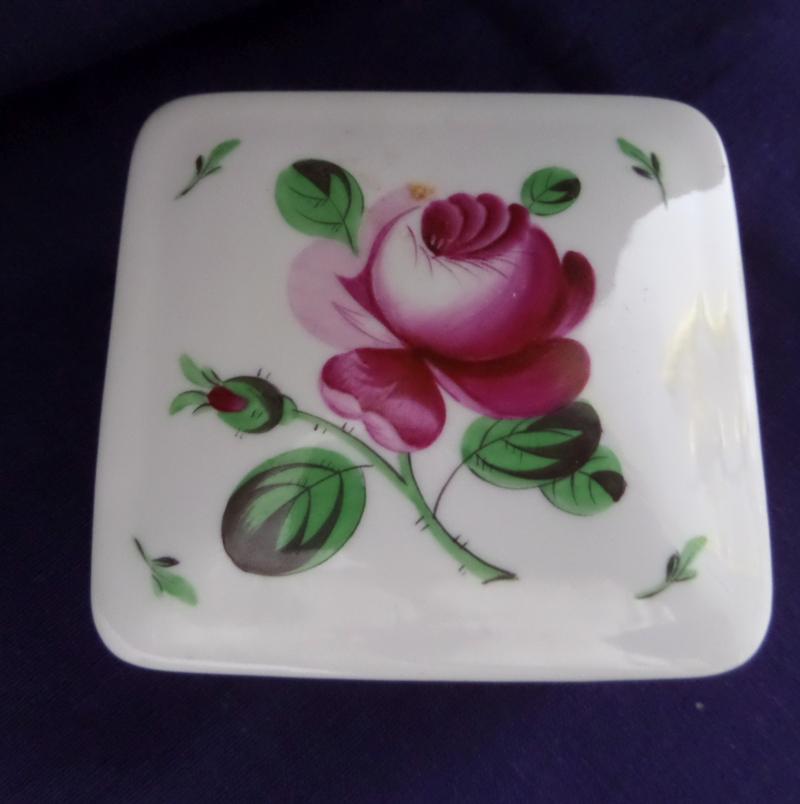 Herendi rózsamintás porcelán bonbonier (1930 körülről). Magassága 4,5 cm, szélessége 8 cm, hosszúsága 9 cm. Egyik sarkán javított.