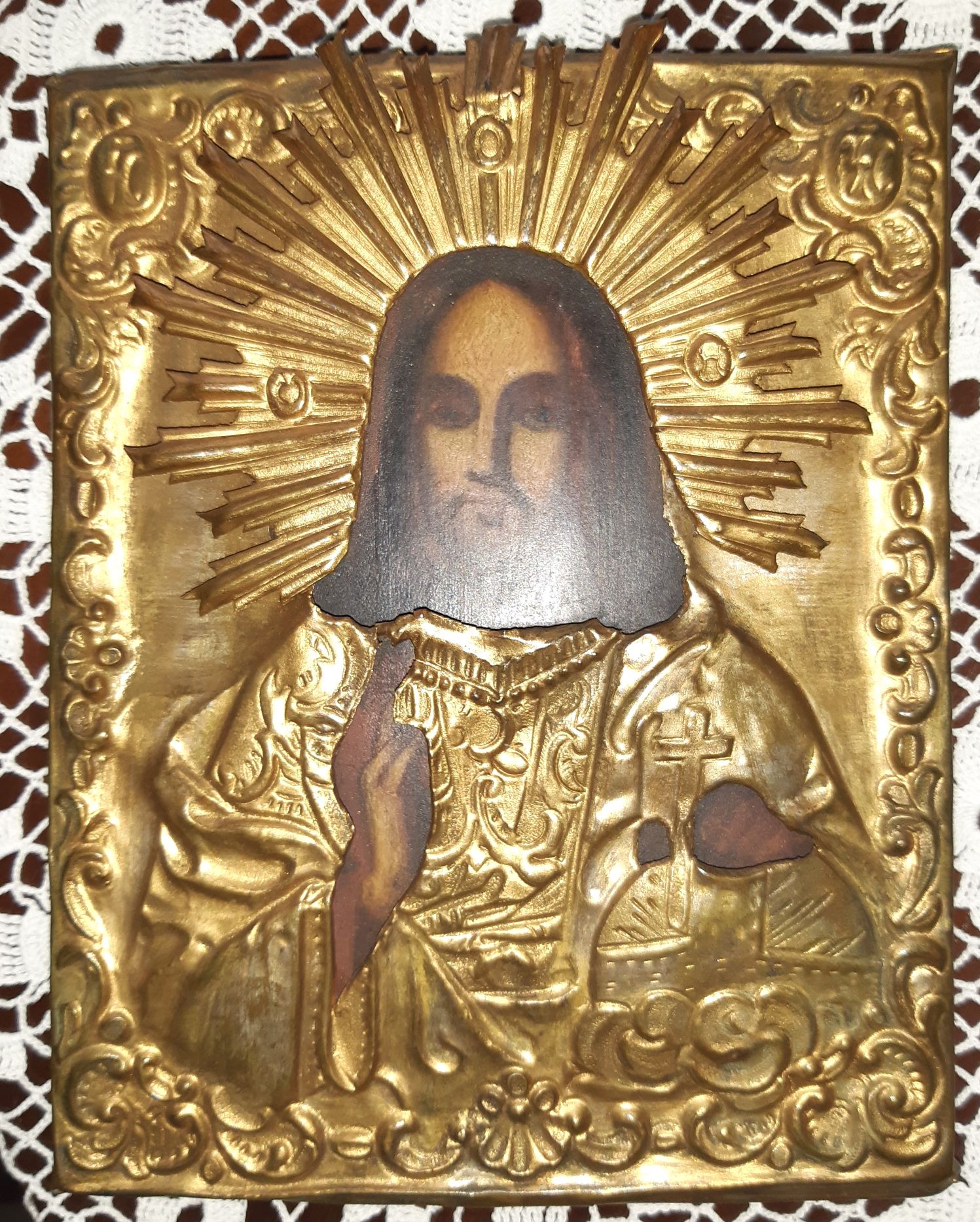 Krisztus a világ ura: XIX. századi antik orosz ikon, aranyozott rézoklád, ép, korának megfelelő állapotban, mérete 18x14 cm
