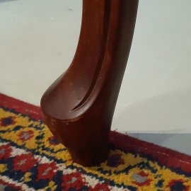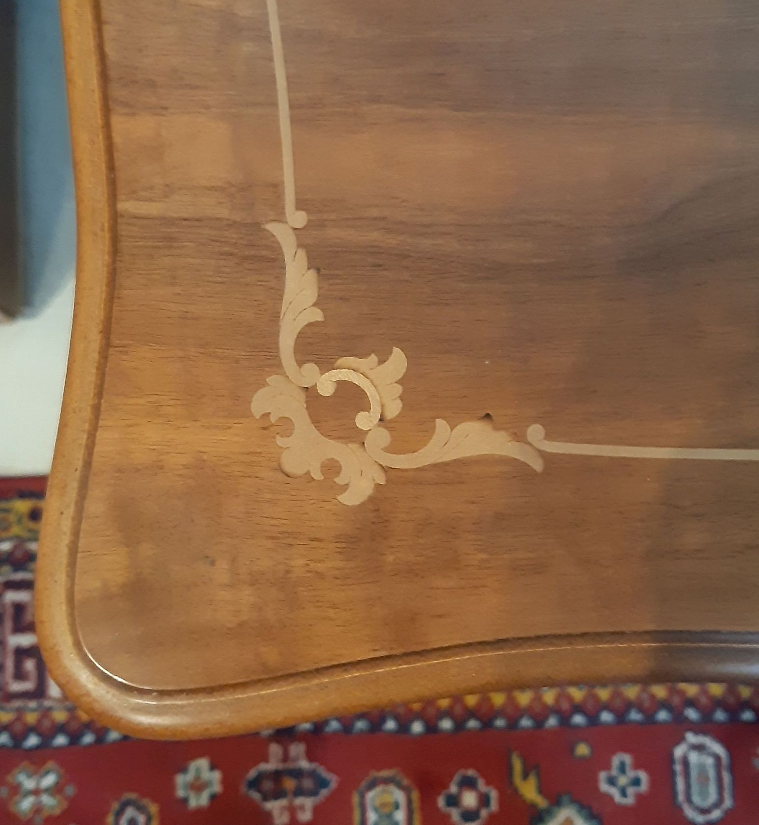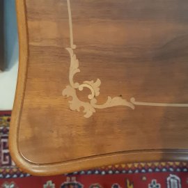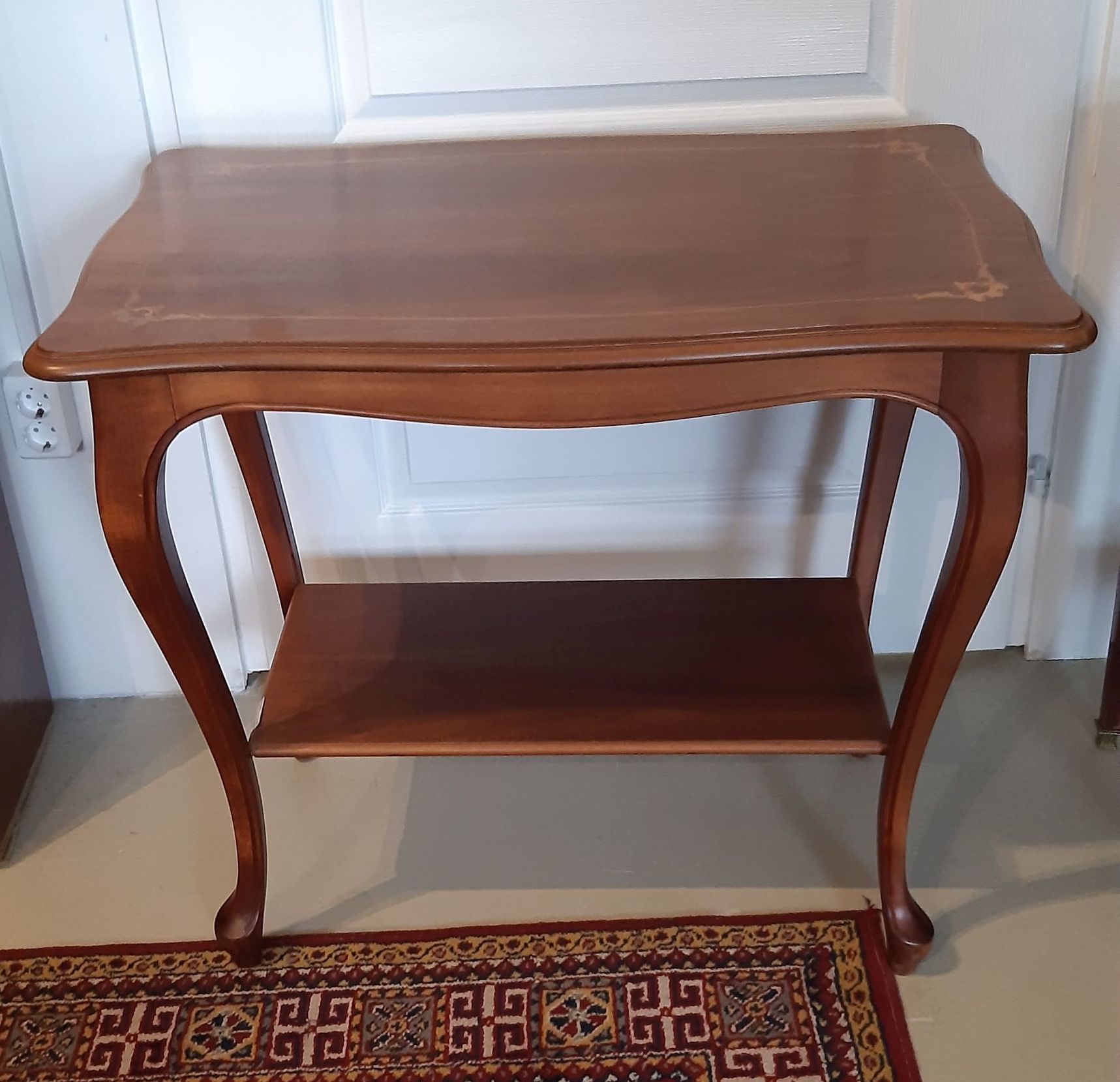 Neobarokk intarziás kisasztal alsó polccal, jó állapotban. magasság: 70,5 cm, asztallap: 80x49 cm
