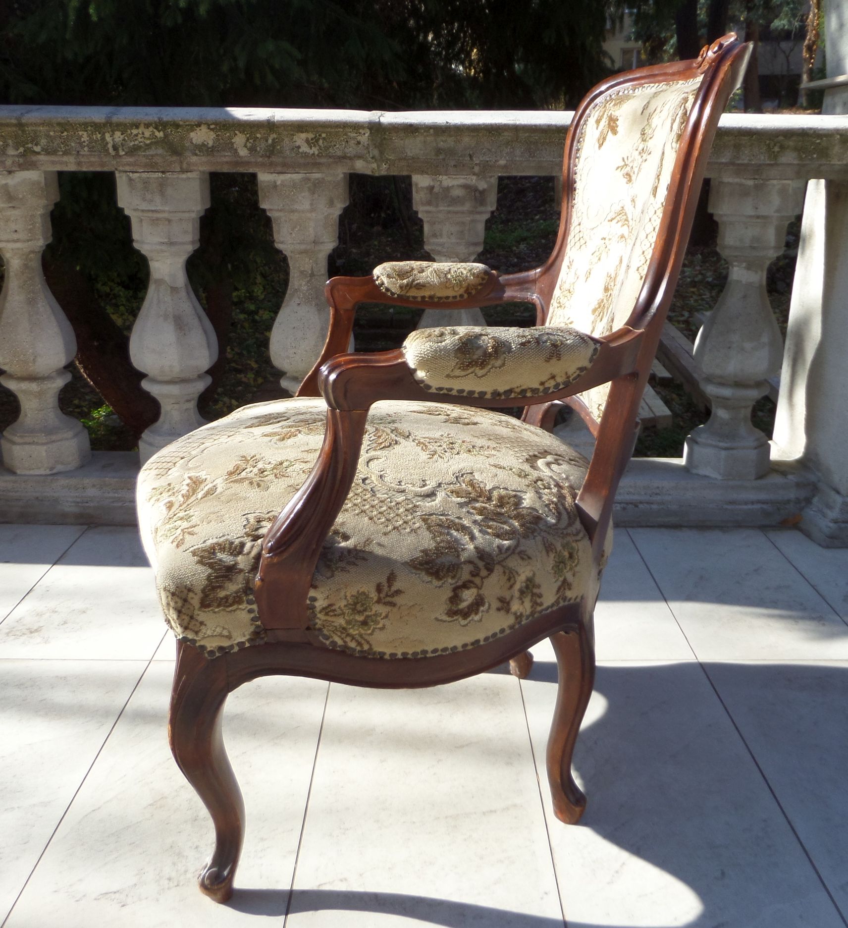 Tömör diófa antik neobarokk karszék, faragott fejrésszel, eredeti kárpittal. Használt, de jó állapotban. Ülőmagasság 45 cm, támla magassága 79 cm, kartámlák közötti szélesség 66 cm.