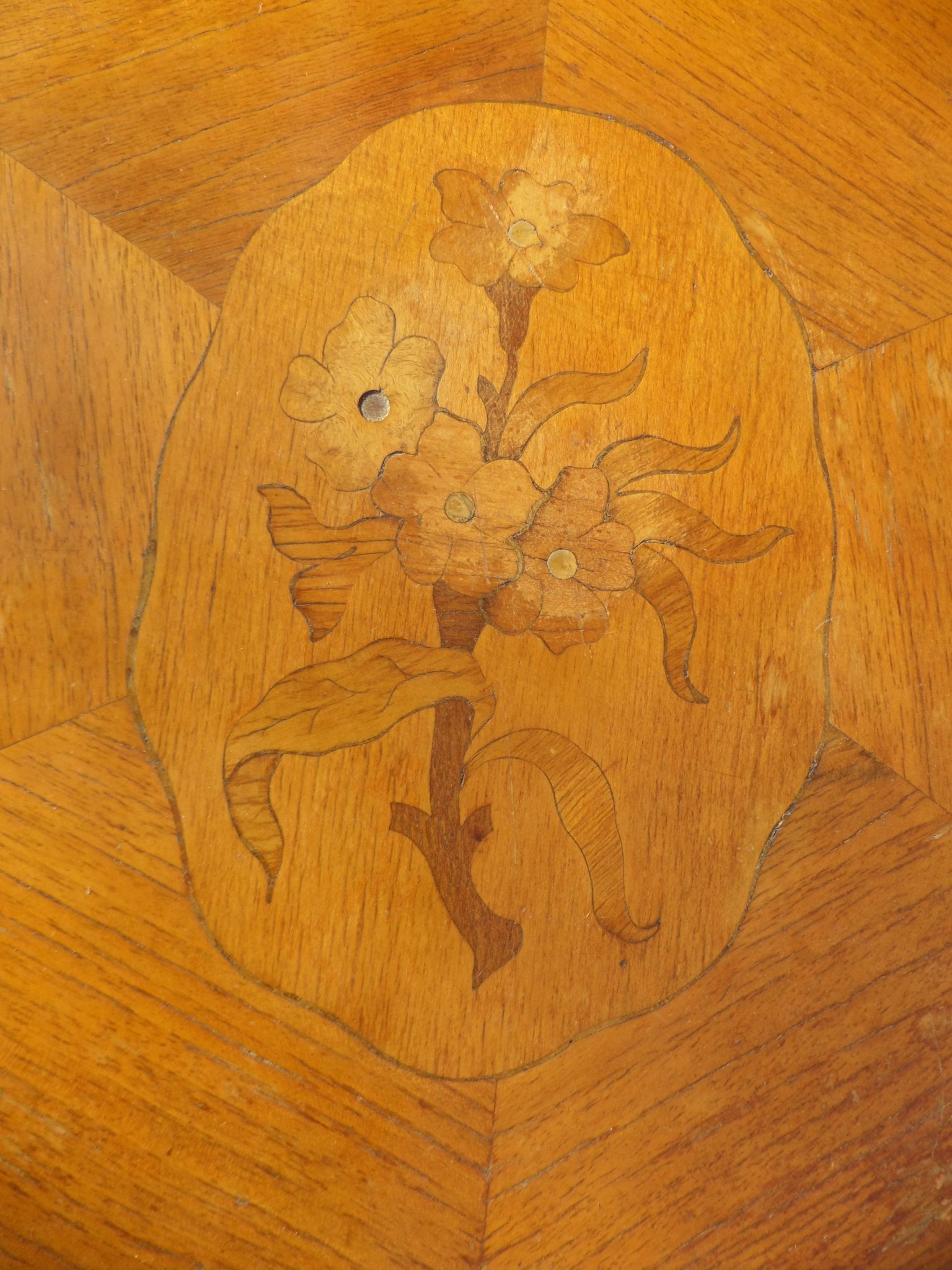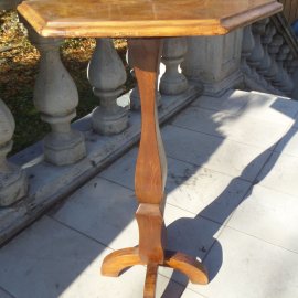 Nyolcszögletű, intarziás virágmintás virágtartó kisasztal, lapja enyhén felázott, sarkai kopottak, az egyik virág közepe hiányzik, szélessége: 50 cm, magassága: 80 cm.
