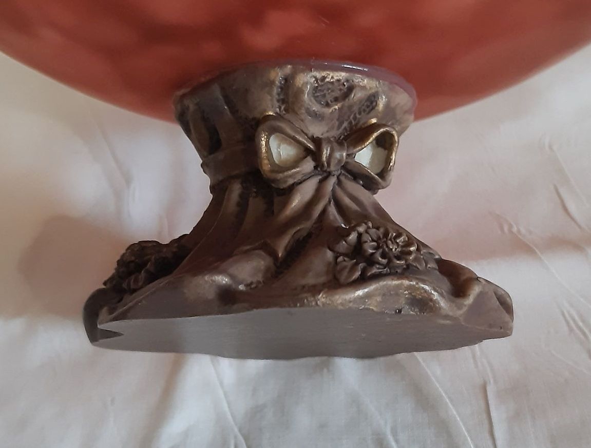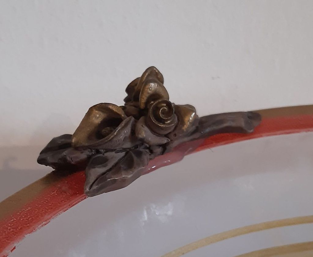 Piros-fehér üvegtál, aranyszínű szegéllyel, bronzszínű gipsz rózsarátétekkel, átmérő: 19 cm.
