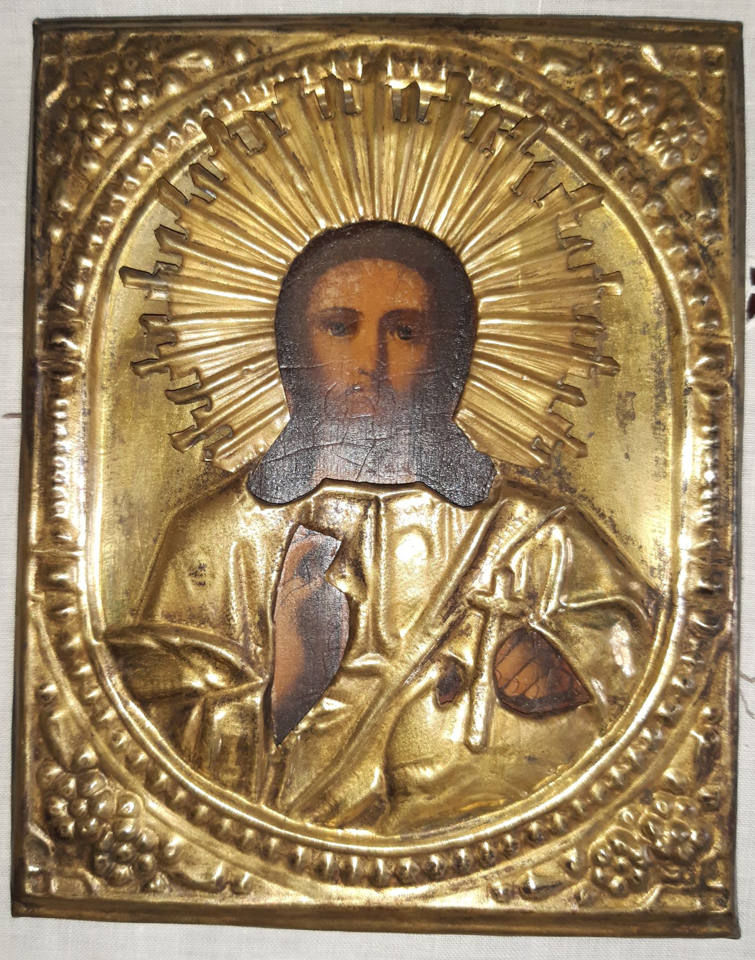 XIX. századi antik orosz ikon, aranyozott réz oklád, ép, korának megfelelő állapotban, mérete 18x14 cm