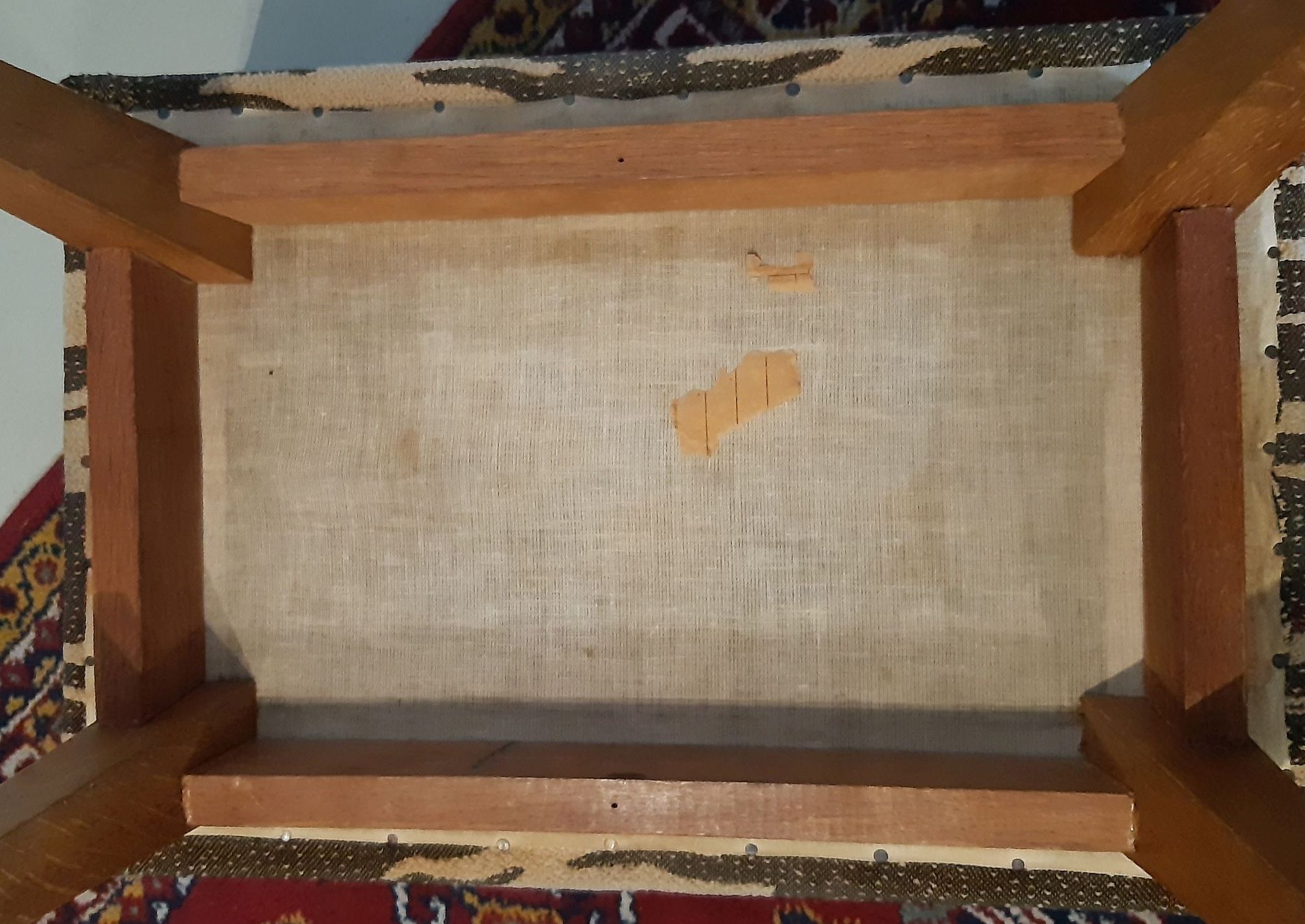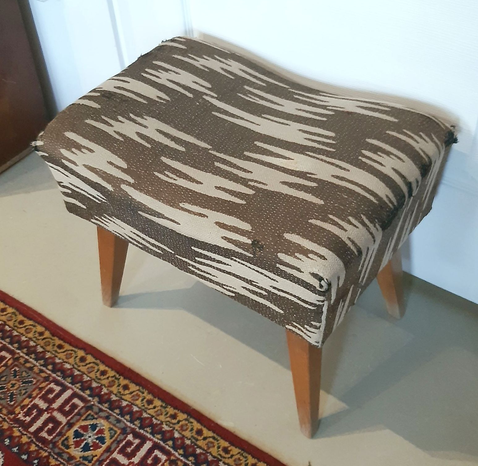 Zöld-fehér puff, kárpitja javításra szorul, falábai épek, szerkezetileg stabil. 40 magas, ülőfelülete 52x36 cm.