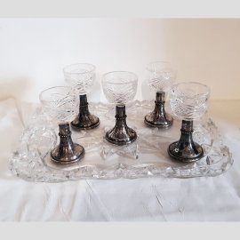 Üveg-alpakka likőröspohár készlet csiszolt üvegtállal