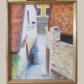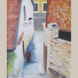 Halasi Horváth István: Patakpart házakkal (80x130 cm)
