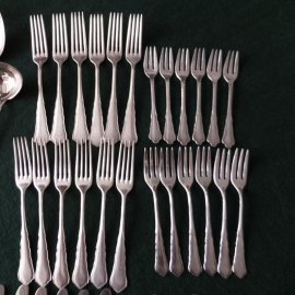 1 db merőkanál, 1 db tortalapát, 3 db szervizkanál, 2 db húsvilla, 2 db vajazókés, 6 db nagy evőkanál, 6 db közepes evőkanál, 6 db teáskanál, 6 db nagy kés, 6 db közepes kés, 12 db villa (2 különböző nyéllel), 12 db desszertvilla (2 különböző nyéllel). WMF Friodur jelzéssel.