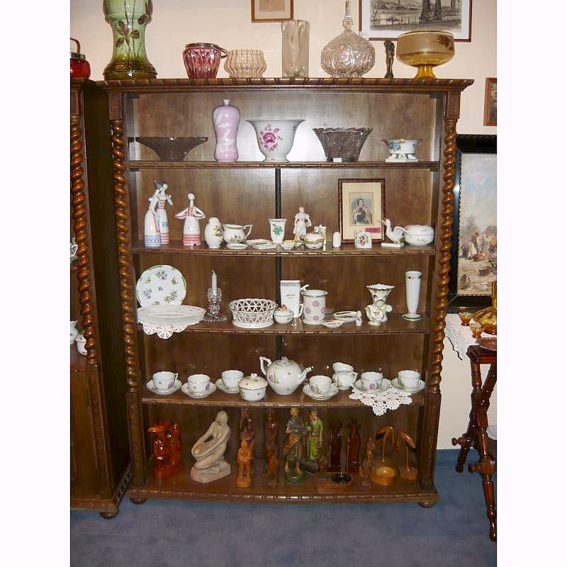 Koloniál, nyitott, fa könyvszekrény, 4 polccal, lábakon. Használt, de hibátlan állapotban. Mérete: 156x122x28 cm.