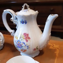 1910-es 20-as évekből származó, új állapotú, Zsolnay porcelán 6 személyes virágos kávés/mokkás készlet. 6 csésze, 6 alja, 1 köntő tetővel, 1 cukortartó tetővel, tejszínes kiöntő hiányzik.