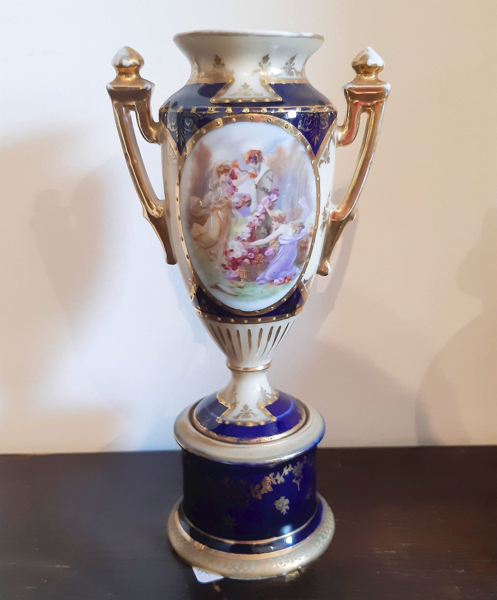 Altwien stílusú porcelán díszváza. Jelzés nélküli, mitológiai jelenetekkel díszített. Magassága 21 cm. Alsó peremén egy darab lepattogzáshiba található (lásd fotó).
