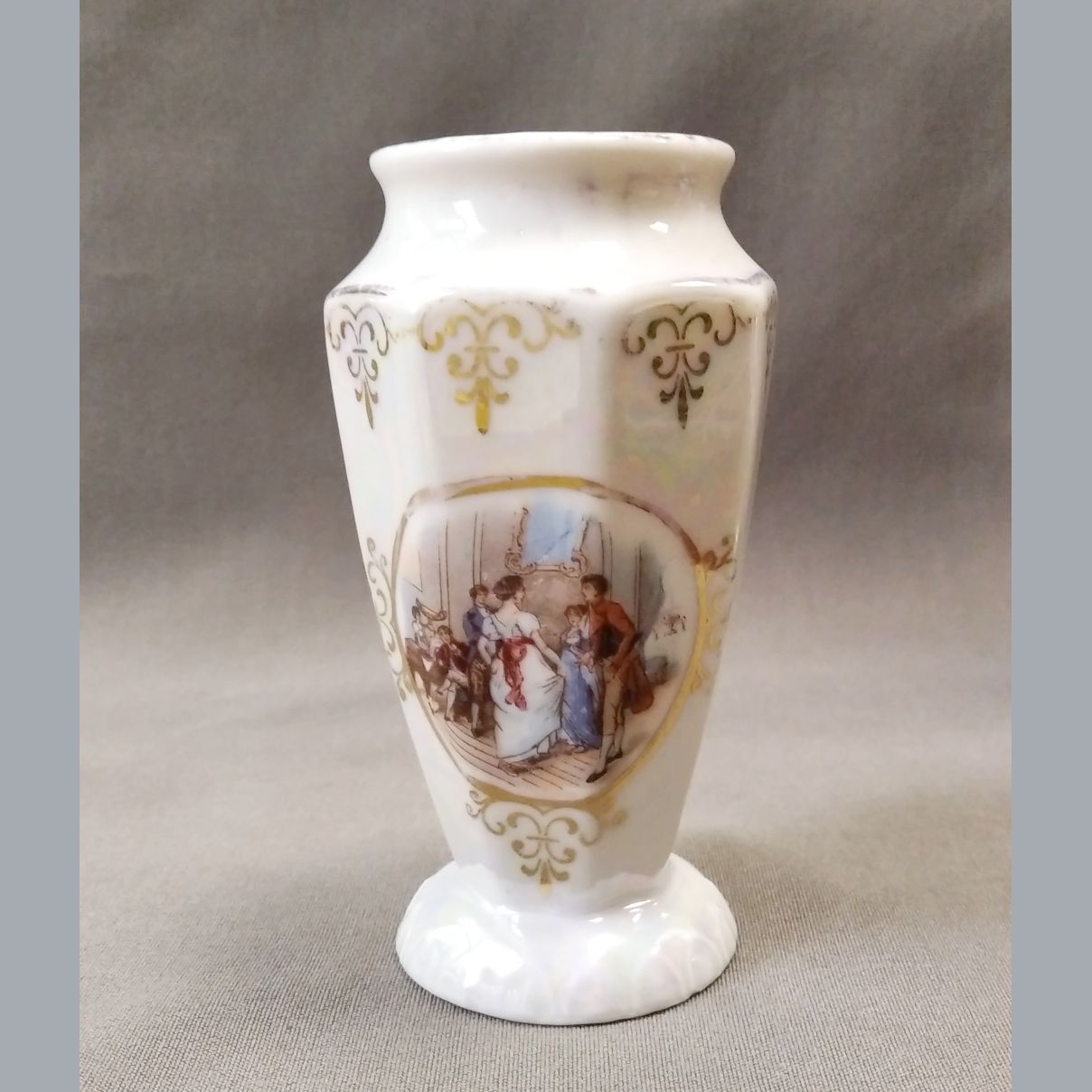 Bálozójelenetes porcelán emlék kisváza, 10,5 cm, kopott aranyozással.