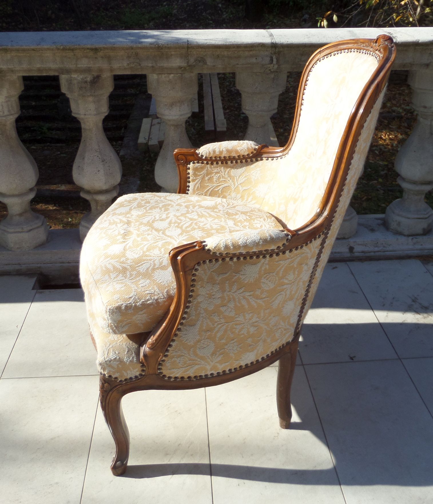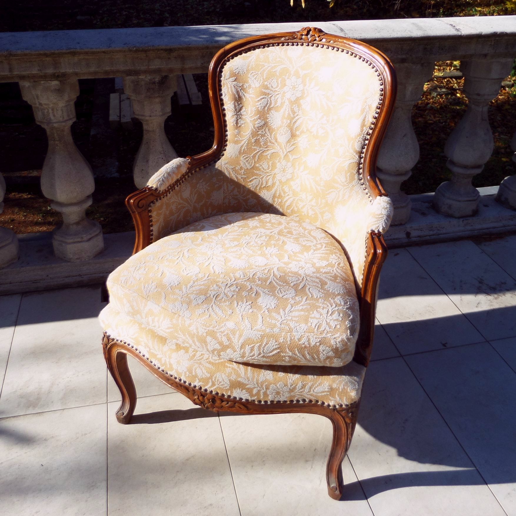 Bécsi neobarokk fotel, restaurált kárpitozással, faragott lábakkal és fejrésszel, jó állapotban. Méretei: ülőmagasság 50 cm. Támla magassága 94 cm, karfaszélesség 60 cm.
