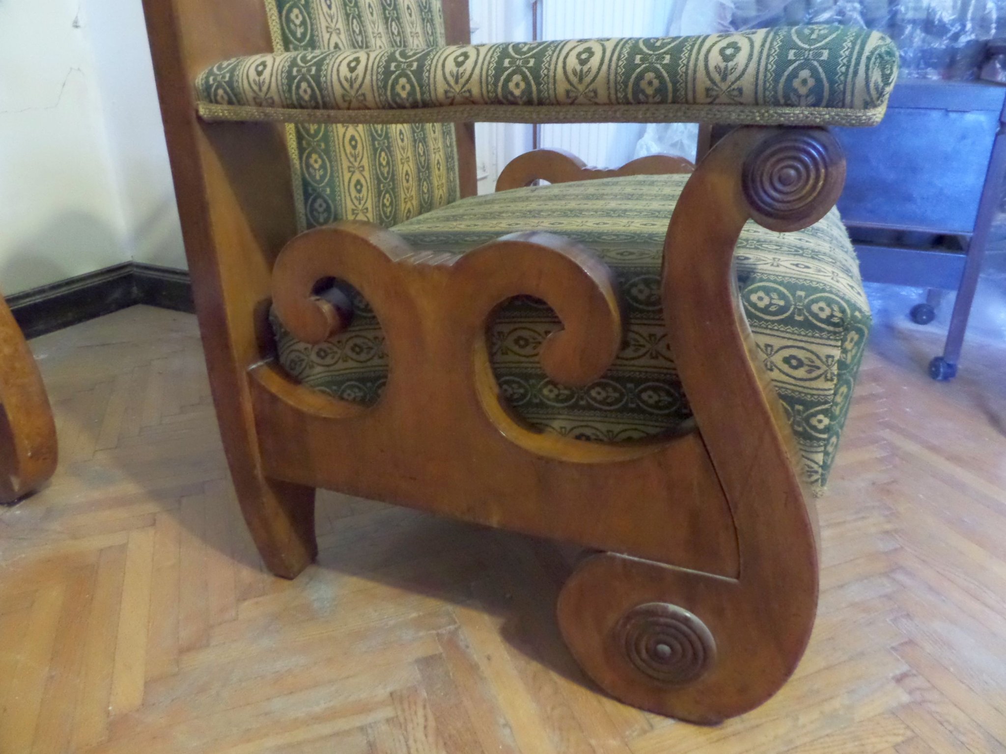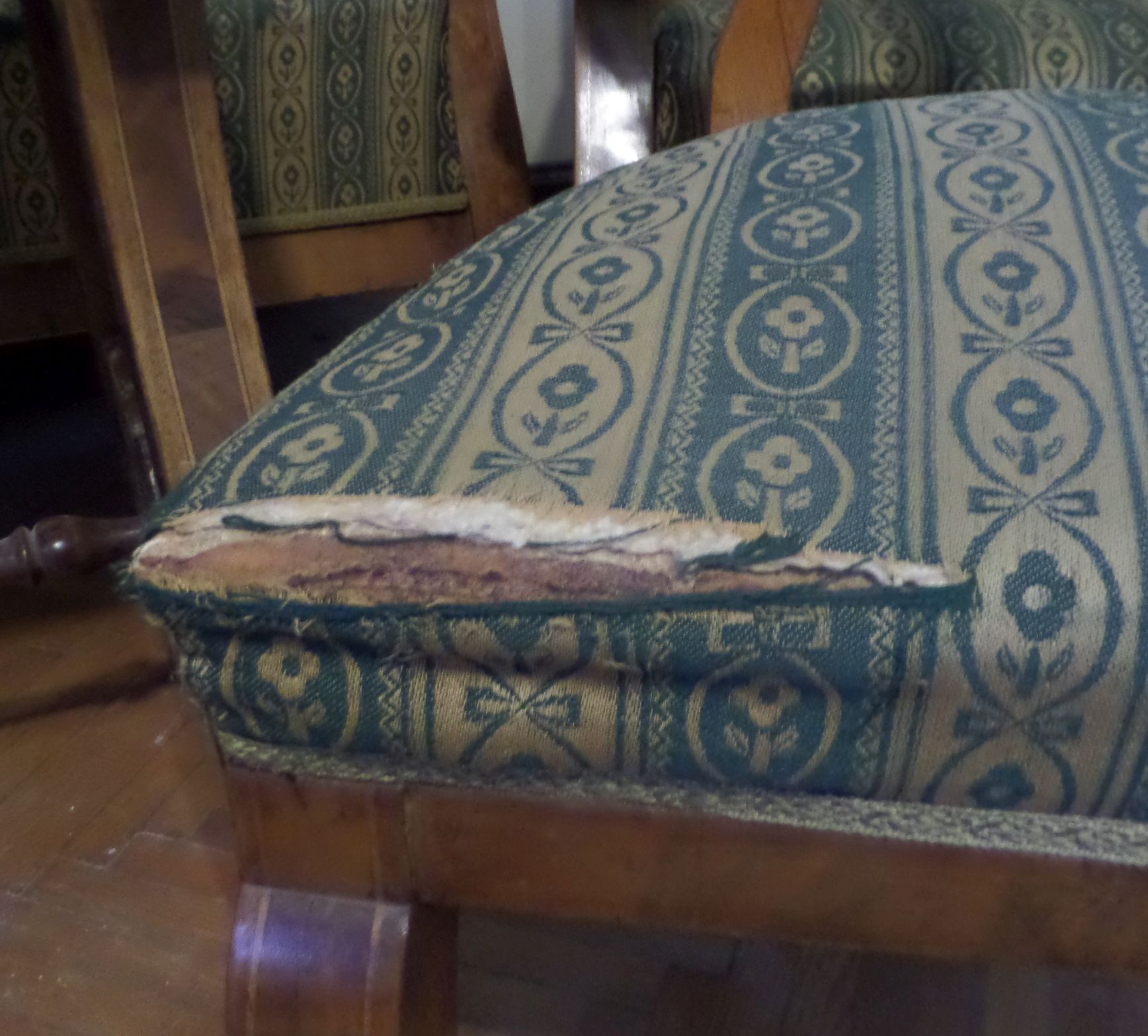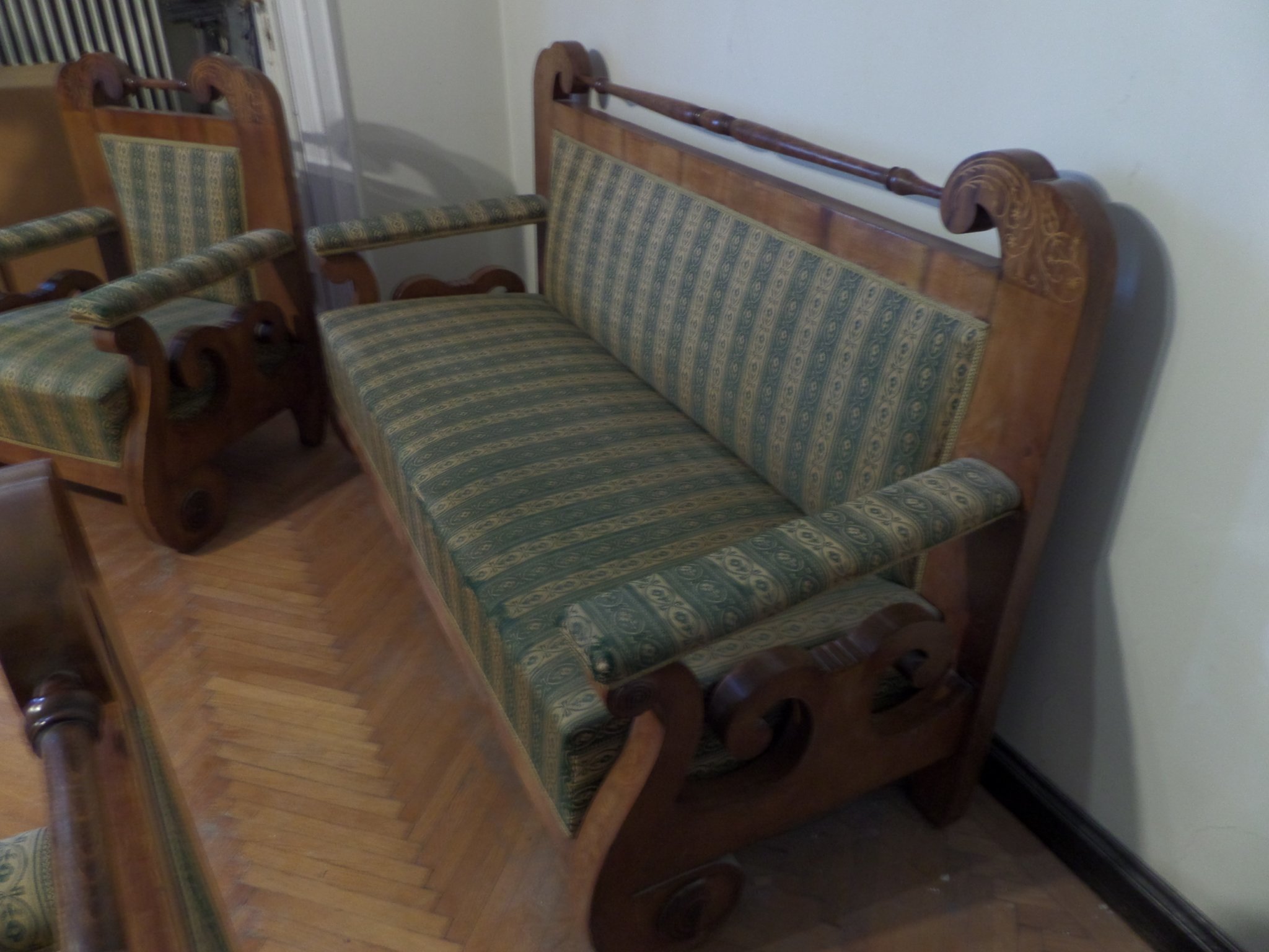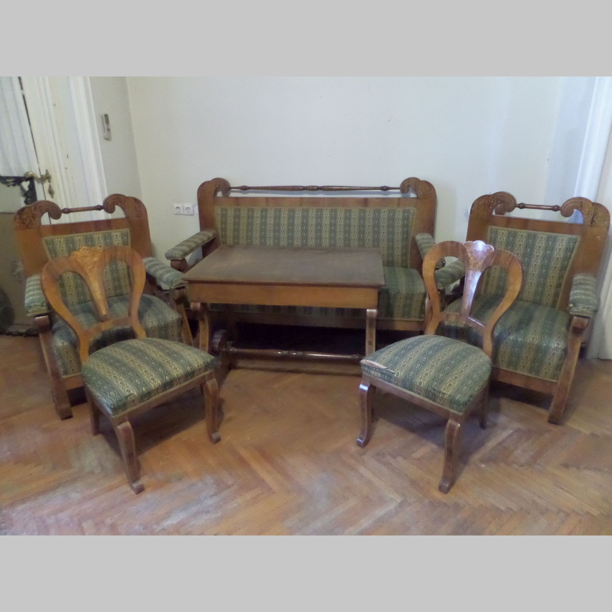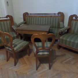 Biedermeier ülőgarnitúra, zöld-fehér népies virágos kárpitos, 6 db-os: 1 kanapé, 2 szék, 2 fotel, 1 asztal,