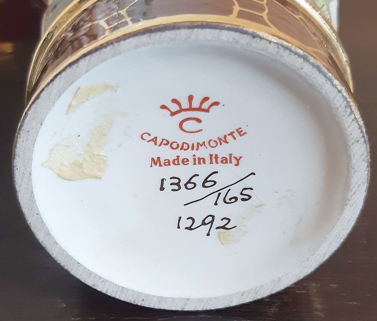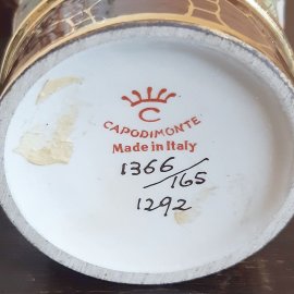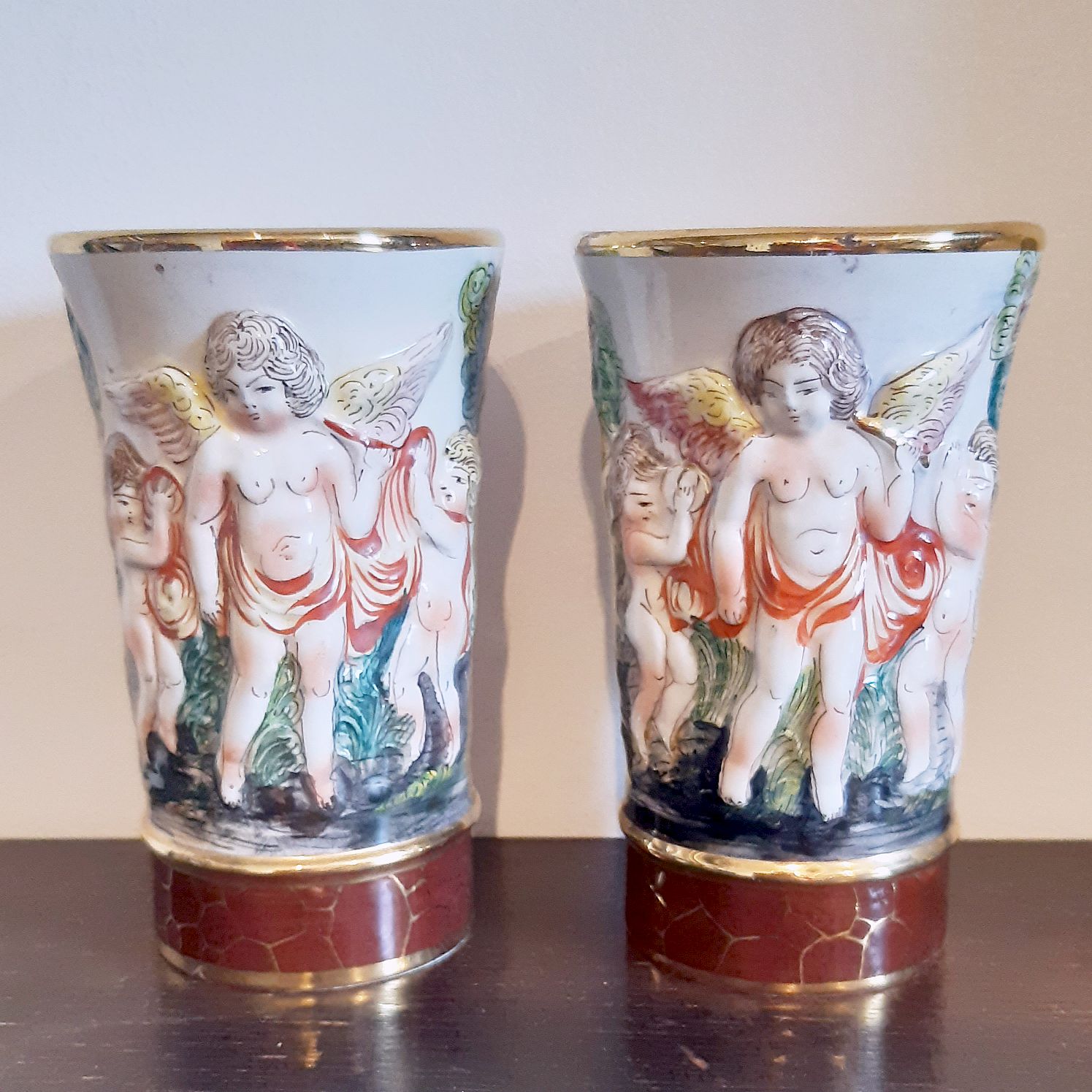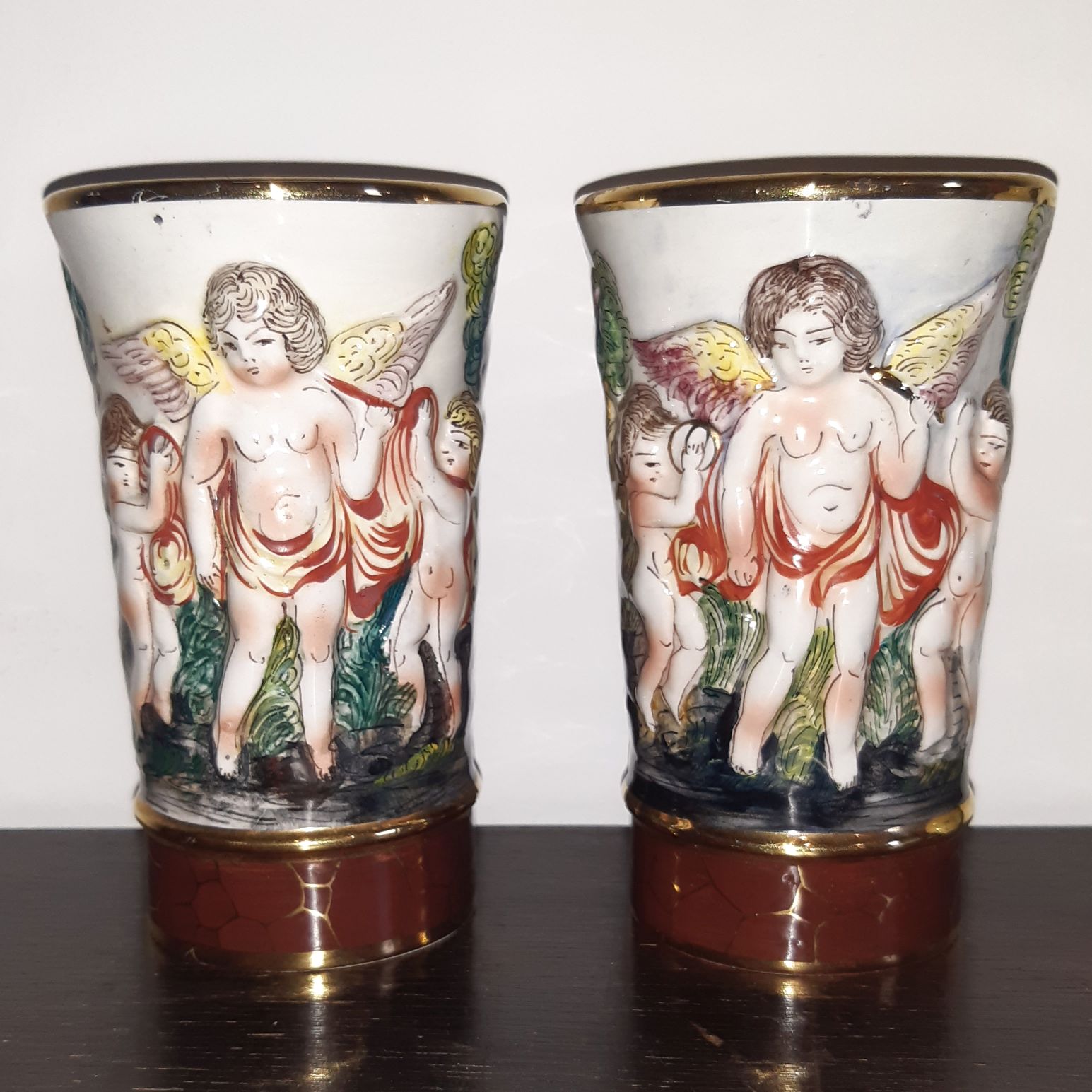 Capodimonte angyalkás, kézzel festett porcelán díszpohár pár, magasságuk 14 cm, átmérőjük 8,5 cm. Hibátlan állapotban. A feltüntetett ár a kettőre együtt értendő.