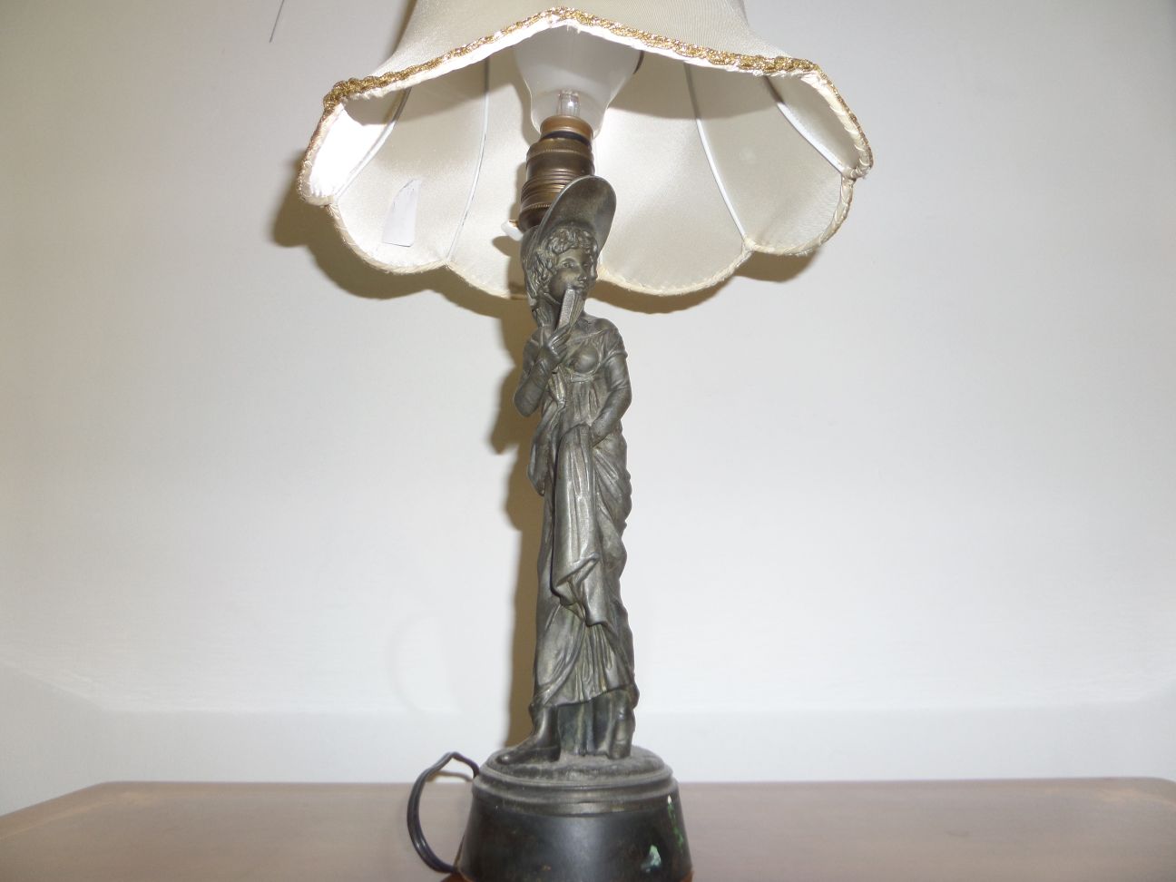 Női figurás, bronz asztali lámpa, fehér selyembúrával. Teljesen ép, működőképes.