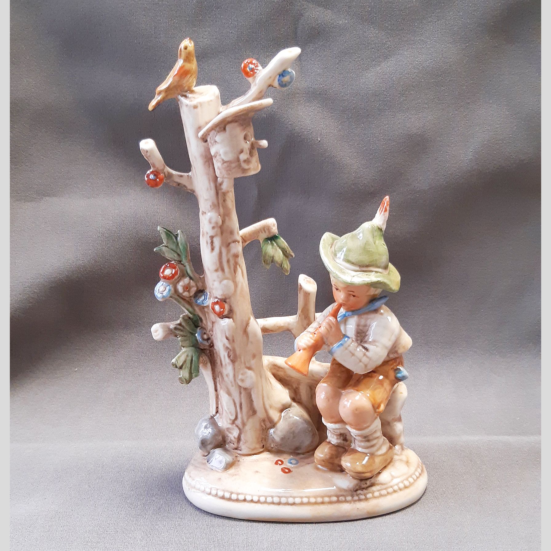 Grafenthal német porcelán figura, furulyás fiú madárkákkal, gazdagon díszített erdei jelenet. Hibátlan állapotban. Alapja 11 x 6 cm. Magassága 18,5 cm.