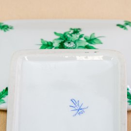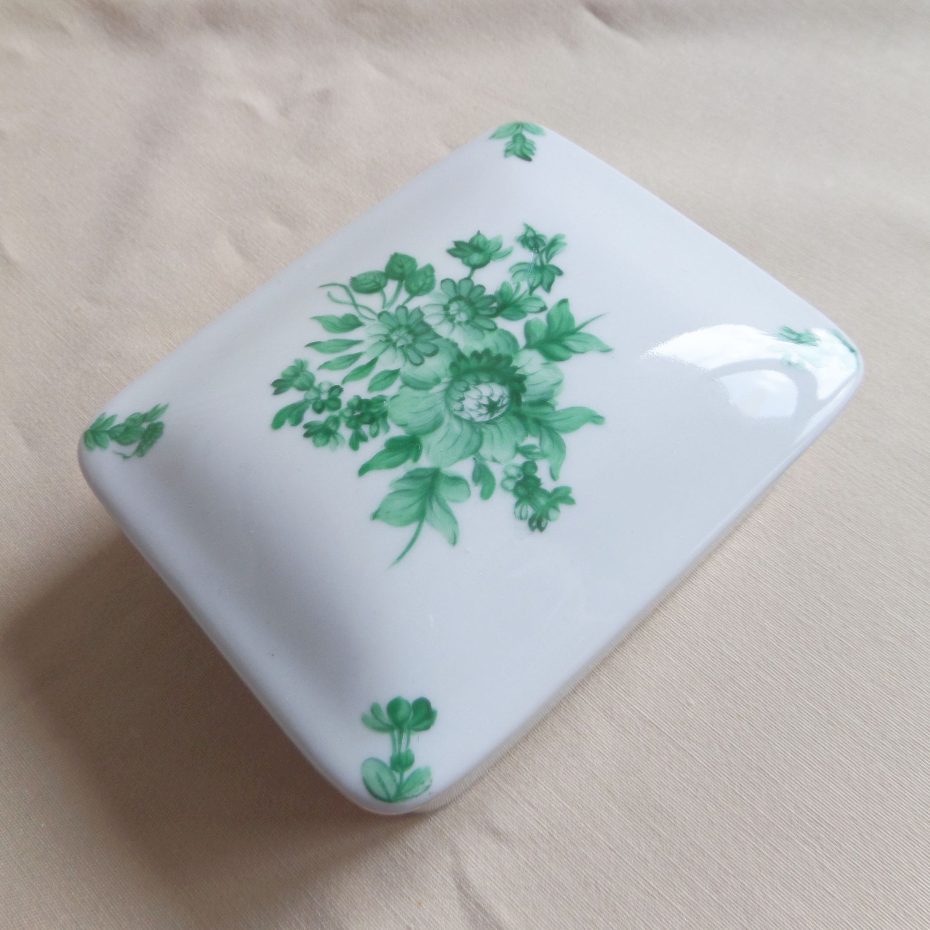 Herendi bonbonier, szögletes, zöld virág mintás, arany bordűrös.