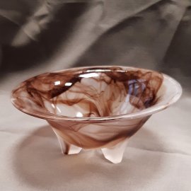 Iparművész üvegtál 3 lábon. Barna füstminta, opálos rózsaszín alapszín. Magassága 7 cm, átmérője 16 cm, lábain lepattogzás.