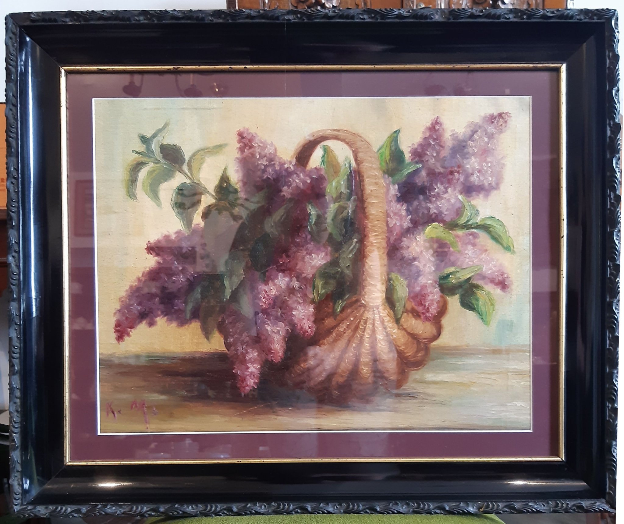 Ismeretlen - Orgonavirágok kosárban Olajfestmény, szignózott. Hibátlan állapotban. keret nélkül: 48 cm x 56 cm