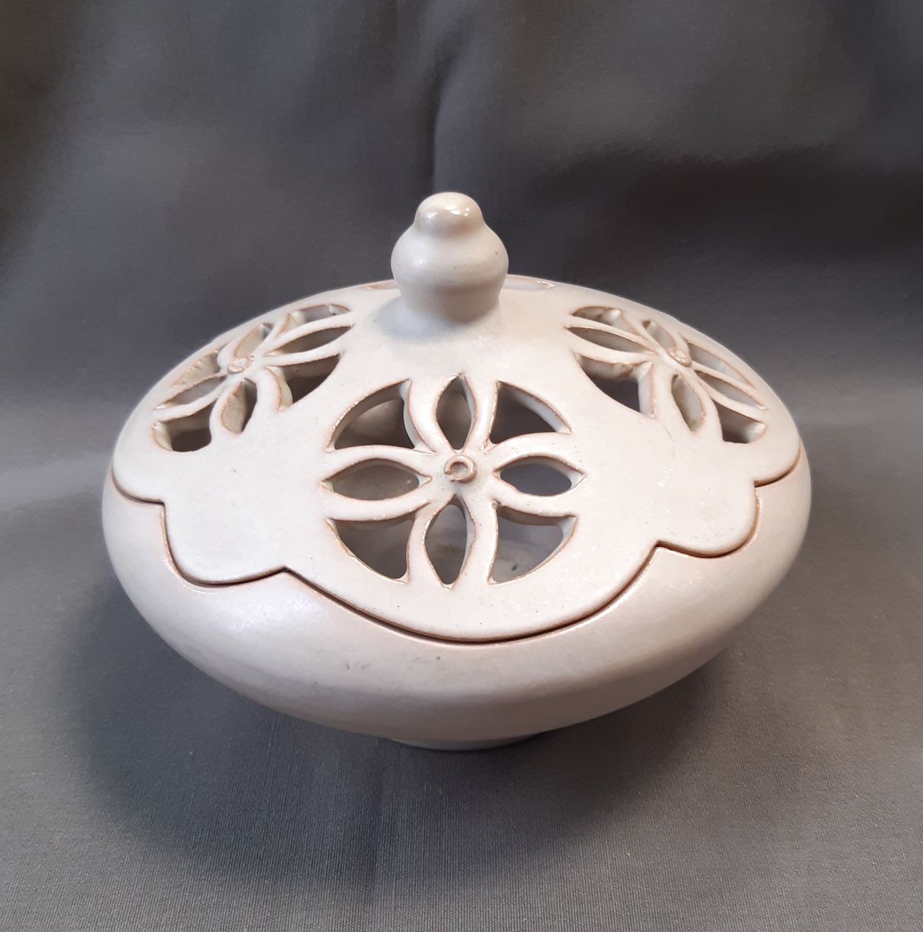 Áttört kerámia bonbonier fedővel, hibátlan állapotban, átmérője 14,5 cm.