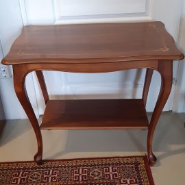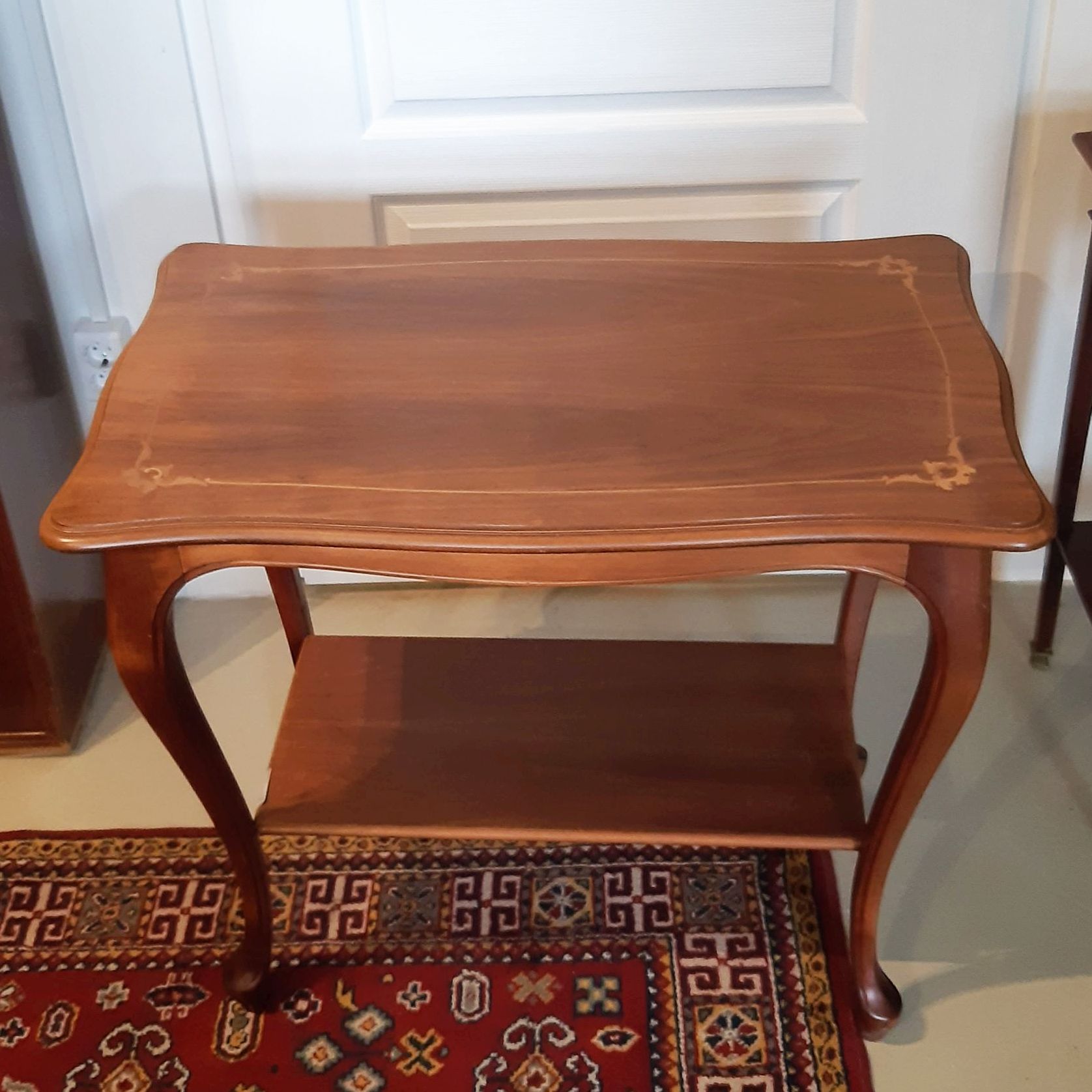 Neobarokk intarziás kisasztal alsó polccal, jó állapotban. magasság: 70,5 cm, asztallap: 80x49 cm