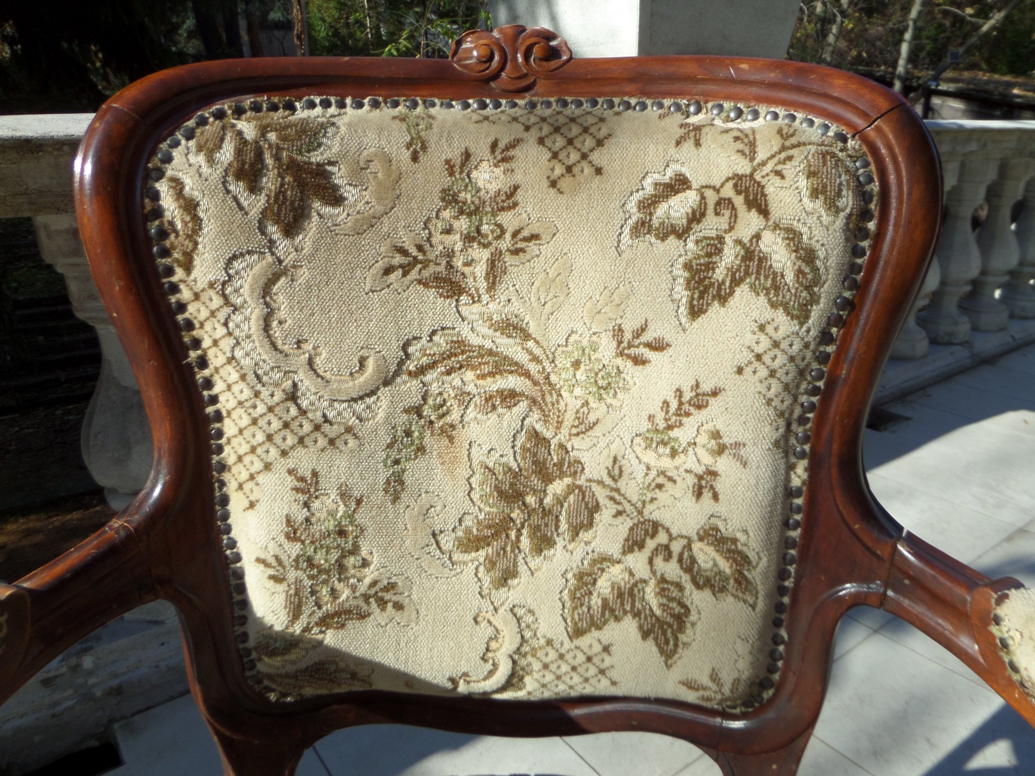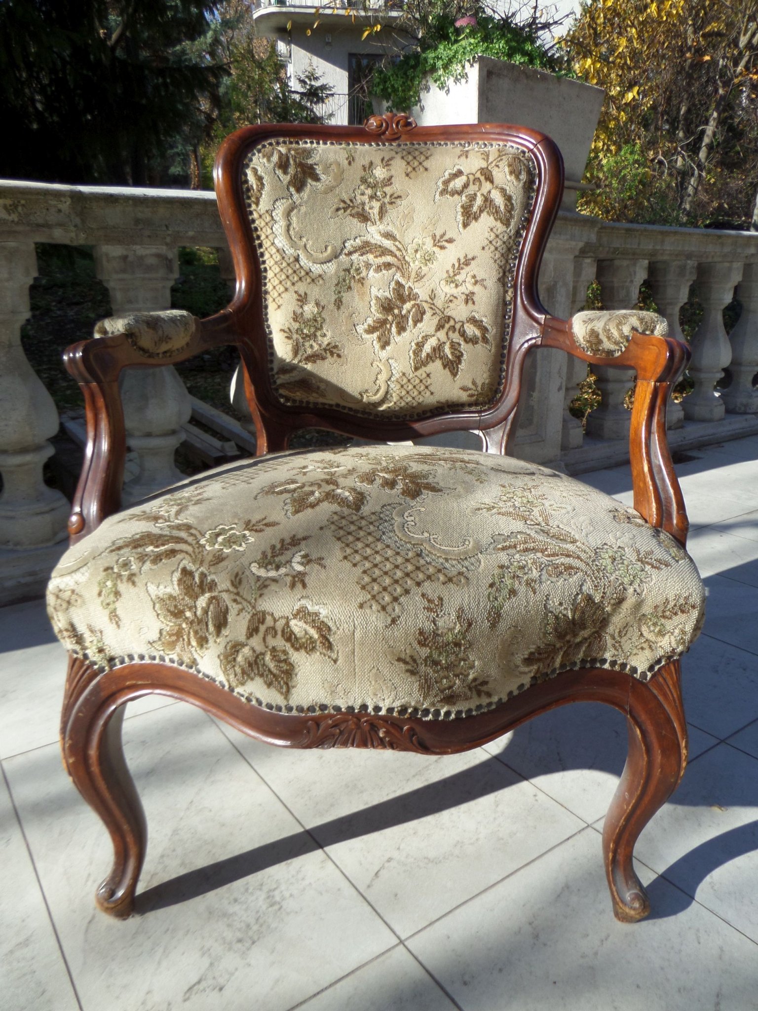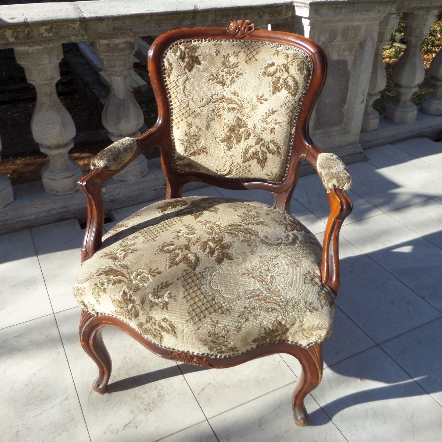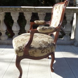 Tömör diófa antik neobarokk karszék, faragott fejrésszel, eredeti kárpittal. Használt, de jó állapotban. Ülőmagasság 45 cm, támla magassága 79 cm, kartámlák közötti szélesség 66 cm.