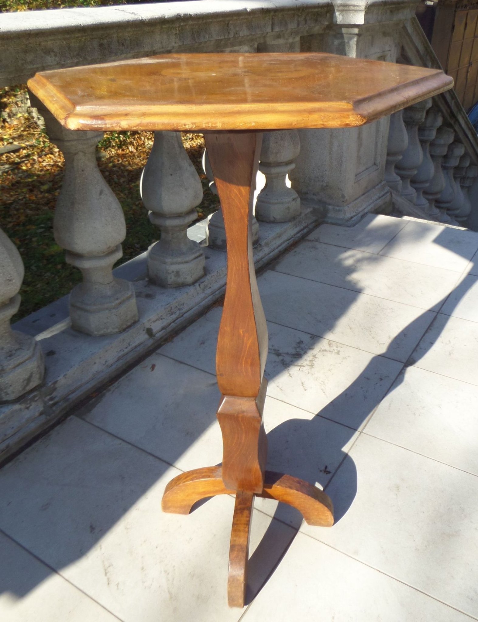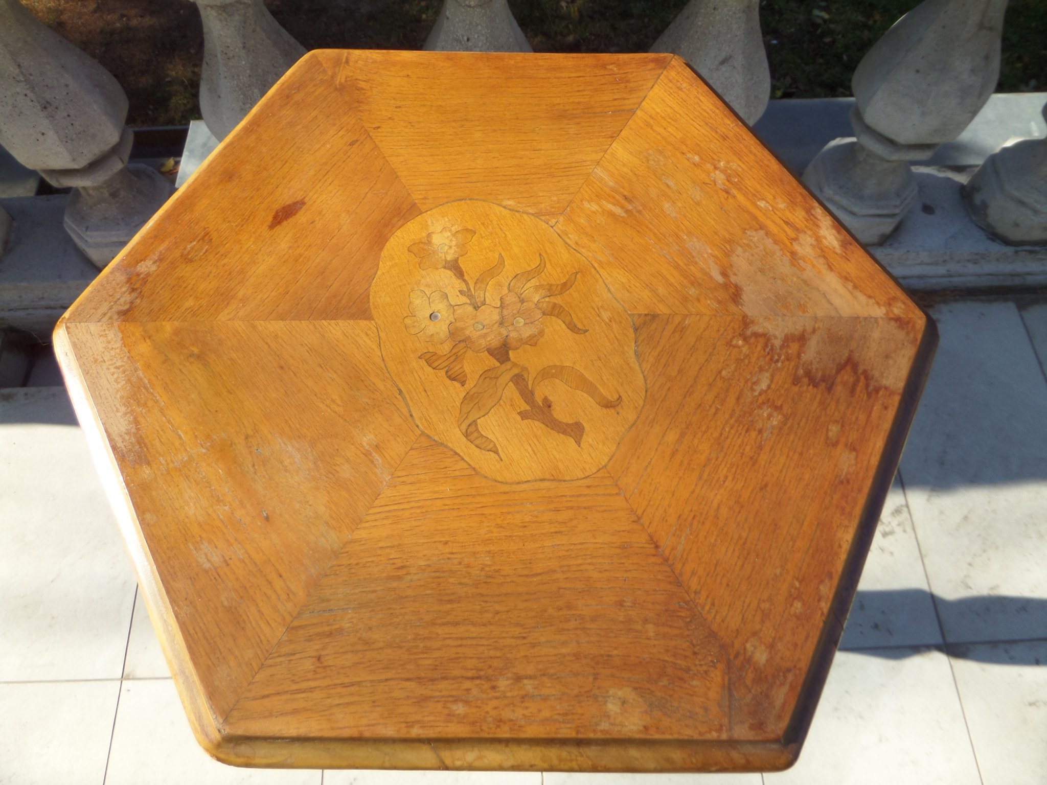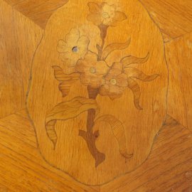 Nyolcszögletű, intarziás virágmintás virágtartó kisasztal, lapja enyhén felázott, sarkai kopottak, az egyik virág közepe hiányzik, szélessége: 50 cm, magassága: 80 cm.