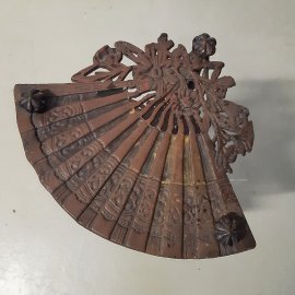 Öntöttvas, 3 polcos virágtartó állvány. Polcai virágdíszített legyezőformájúak. Sérülésmentes. Magassága 46 cm, szélessége 26 cm. Golyólábakon áll.