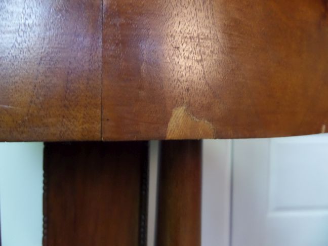 Oszloplábú kerek asztal. Felújításra szorul (lásd fotók). Asztallap átmérője: 90 cm Magasság 81 cm. Talapzat: 52 x 52 cm