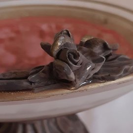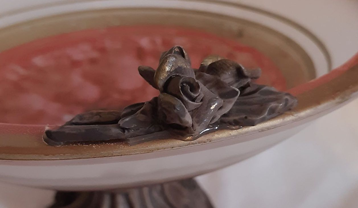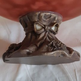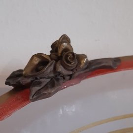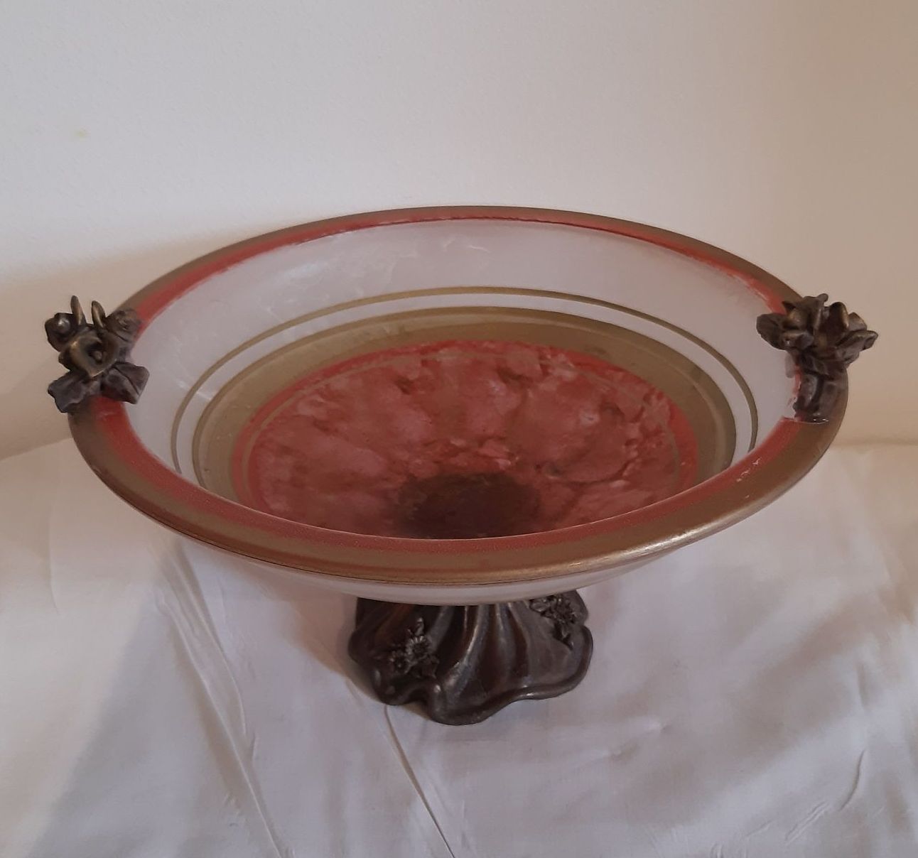 Piros-fehér üvegtál, aranyszínű szegéllyel, bronzszínű gipsz rózsarátétekkel, átmérő: 19 cm.
