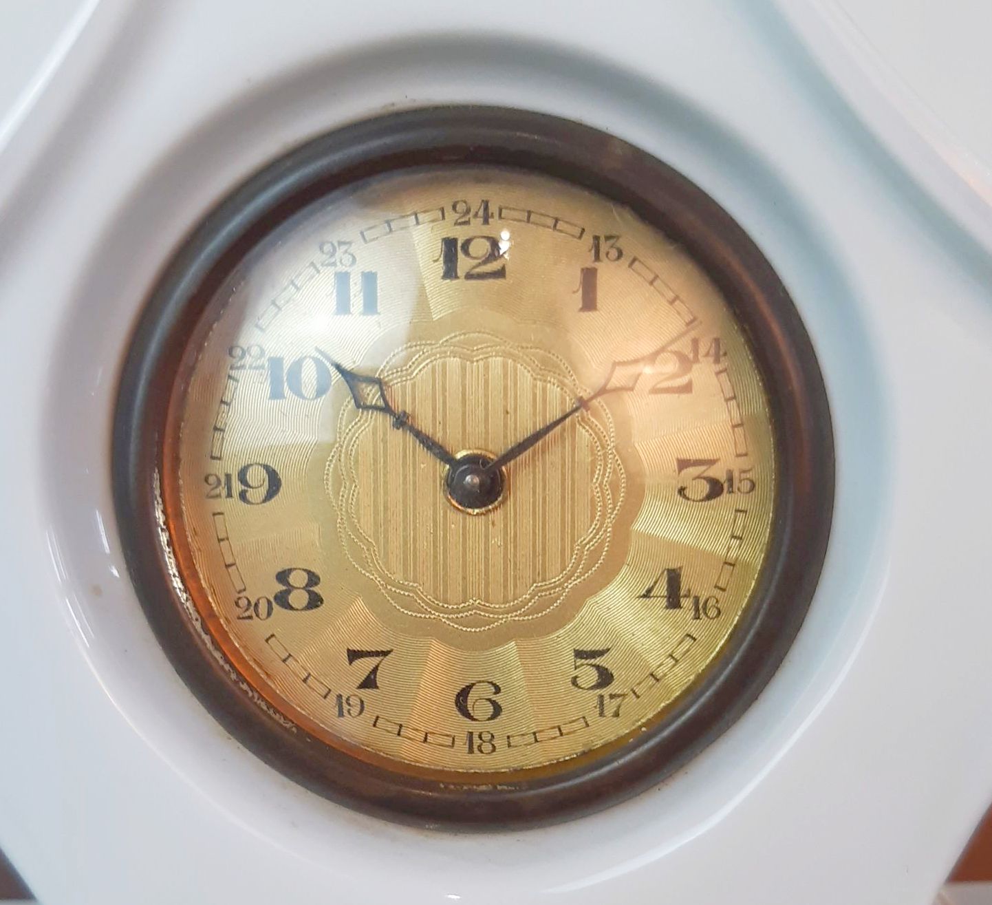 Rosenthal porcelán asztali óra, arany festéssel. Csúcsán javított (lásd fotó), felhúzója hiányzik, de szerkezete működőképes. Méretek: 12,5x13,2 cm