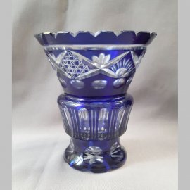 Kétnyakú, kék, cseh, iparművészeti üvegváza