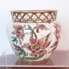 Zsolnay porcelán virágos kaspó, áttört szegéllyel